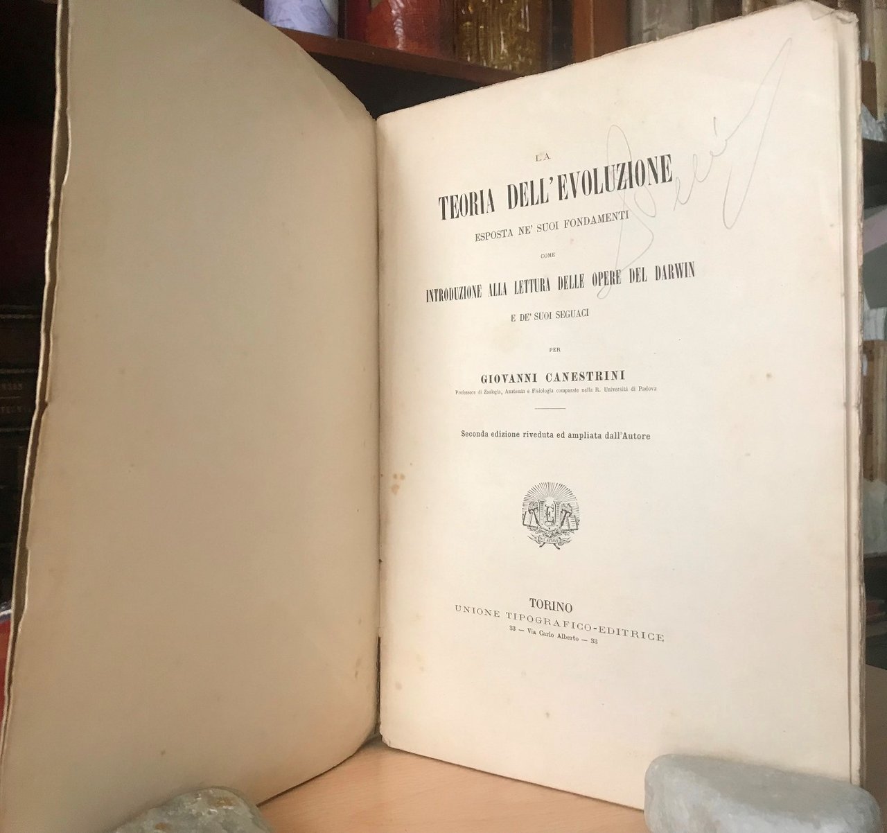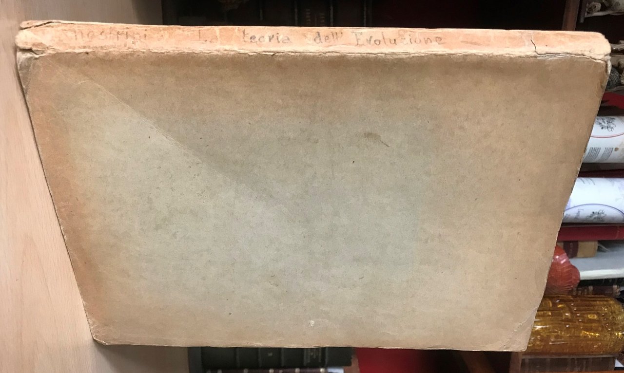Volume in 4, brossura editoriale, titolo manoscritto al dorso (altra copia legata in mezza pelle, titolo al dorso ornato), occhiello, frontespizio, 258 pp., carta di pubblicit editoriale, bianca finale. Interessante e divulgativa esposizione sulla teoria dell'evoluzione, la lotta per l'esistenza e l'ereditariet dei caratteri attraverso l'elezione sessuale e le leggi della variazione sino a giungere alla razza umana. Due capitoli finali sulle prove di fatto dell'origine animale della razza umana. Rare fioriture della carta, lievi mende d'uso alla legatura. In buono stato, di grande interesse ed ormai scarsamente reperibile.