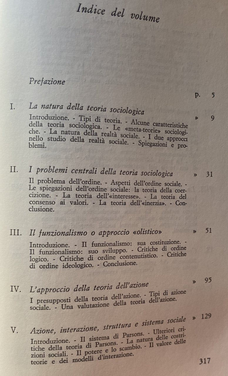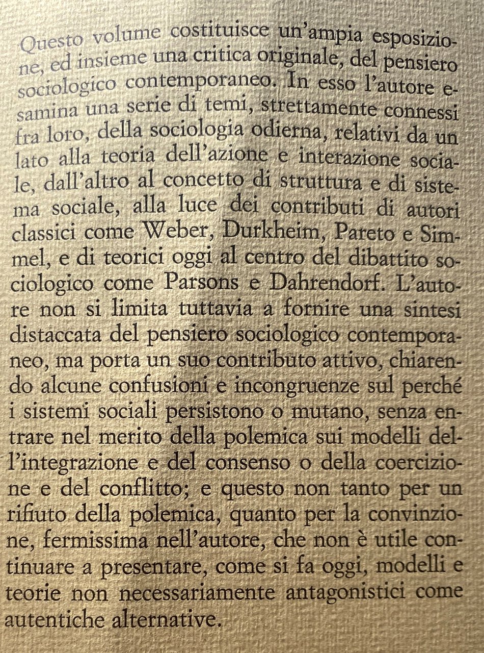 Questo volume costituisce un'ampia esposizione, ed insieme una critica originale, del pensiero sociologico contemporaneo. In esso l'autore esamina una serie di temi, strettamente connessi fra loro, della sociologia odierna, relativi da un lato alla teoria dell'azione e interazione sociale, dall'altro al concetto di struttura e di sistema sociale, alla luce dei contributi di autori classici come Weber, Durkheim, Pareto e Simmel, e di teorici oggi al centro del dibattito sociologico come Parsons e Dahrendorf. L'autore non si limita tuttavia a fornire una sintesi distaccata del pensiero sociologico contemporaneo, ma porta un suo contributo attivo, chiarendo alcune confusioni e incongruenze sul perché i sistemi sociali persistono o mutano, senza entrare nel merito della polemica sui modelli dell'integrazione e del consenso o della coercizione e del conflitto; e questo non tanto per un rifiuto della polemica, quanto per la convinzione, fermissima nell'autore, che non è utile continuare a presentare, come si fa oggi, modelli e teorie non necessariamente antagonistici come autentiche alternative.