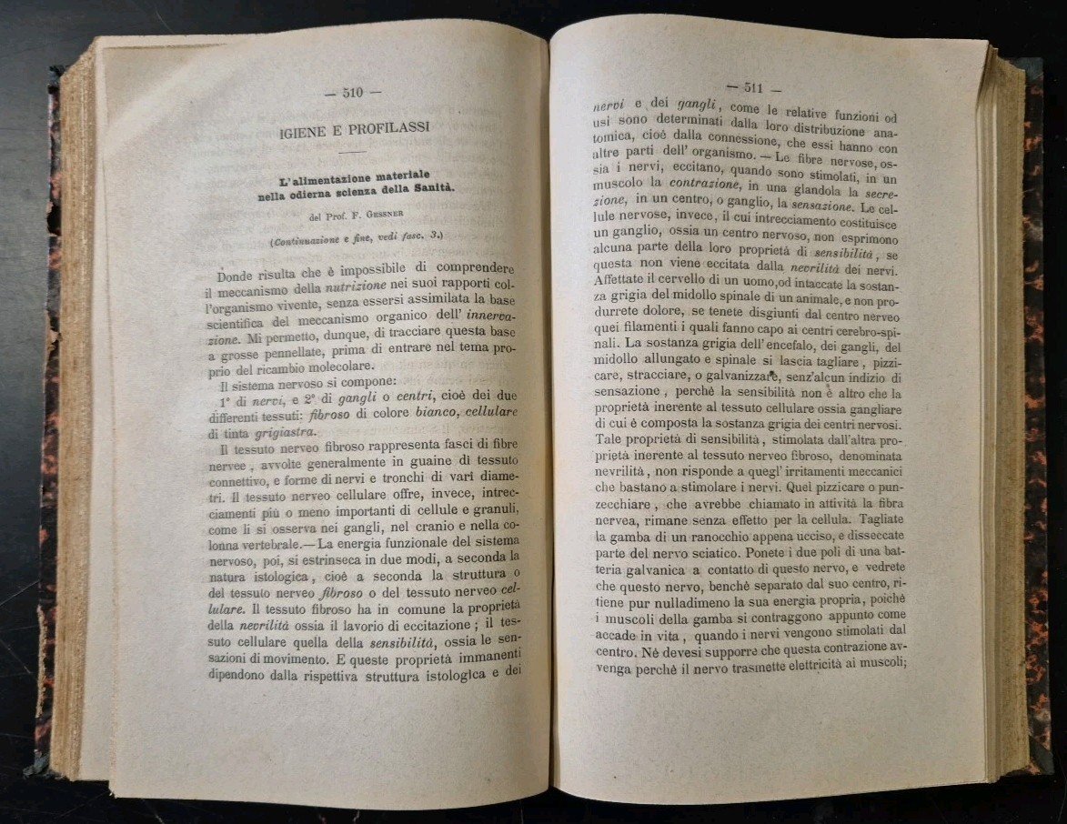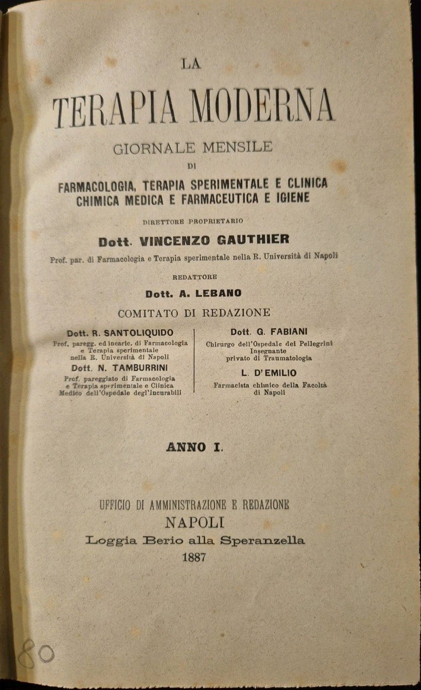 LA TERAPIA MODERNA GIORNALE MENSILE di Farmacologia, Terapia Sperimentale e Clinica Chimica Medica e Farmaceutica e Igiene di Vincenzo Gauthier. Napoli, ufficio di amministrazione e redazione, 1887. 752 pagine, figure in bianco e nero nel testo. Copertina coeva in mezza pelle. Dimensioni: 15 x 22,5 cm. Stato di conservazione: molto buono (fioriture, spellature alla copertina) Libro antico medicina