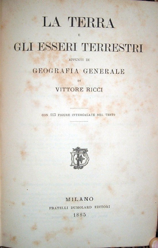 In-8° (cm 21,4x14,1), pp. XIV, (2), 1087, (1), legatura coeva in mezza tela con titoli in nero al dorso. Con 113 illustrazioni in bianco e nero nel testo. Qualche segno d'umido, in particolare alle prime e alle ultime pagine, per il resto esemplare in stato di conservazione molto buono. Indice: Prefazione. Parte prima. La terra qual corpo fisico (Geografia fisiografica). Libro primo. Dei rapporti della terra col sistema solare (Geografia atronomica). 1. Della forma e grandezza della terra; 2. Del movimento della terra attorno a sé (Rotazione); 3. Del movimento della terra attorno al sole (Rivoluzione); (Giro astronomico delle stagioni e dei giorni); 4. Di alcune variazioni; 5. Della luna; 6. Del sole e del sistema solare. Libro secondo. Della formazione e trasformazione della terra (Geogr. geologica e mineral.). 1. Della costituzione della crosta terrestre; 2. Dei terreni geologici e degli avanzi fossili. Formazioni sedimentarie; Formazioni cristalline; Storia geologica della regione italiana; 3. Appendice. I.a. Sulla distribuzione geografica d'alcuni minerali; A. Minerali non metallici più comuni; B. Principali metalli e pietre preziose. Libro Terzo. Dello stato presente della superficie terrestre (Geografia fisica). Capo primo. Della superficie terrestre e in particolare della solida (Topografia generale, Orografia). 1. Sulla distribuzione e sui rapporti delle terre e dei mari; 2. Sulle forme superficiali delle masse terrestri (Tavola di bassure e rialti), (Estensione d'alcuni bassipiani), (Altezza assoluta d'alcuni monti nelle diverse regioni del globo); 3. Dei vulcani e del vulcanesimo. Capo secondo. Dell'acque terrestri (Idrografia). 1. Del mare e de' suoi fenomeni (Oceanografia), (Tavola d'oceani e mari); 2. Delle acque continentali. Nota d'alcune acque minerali d'Italia e di fuori (Tavola di fiumi), (Tavola di laghi). Capo terzo. Dell'atmosfera e de' suoi fenomeni (Geografia meteorologica). 1. Composizione, massa e peso dell'aria. Tavola di altitudini abitate e toccate dall'uomo; 2. Della temperatura dell'aria. A. Sua distribuzione orizzontale (temperatura media d'alcuni luoghi); B. Distribuzione verticale della temperatura (Tavola delle nevi perpetue); C. De' ghiacciai; 3. Delle correnti aeree. A. La pressione barometrica e i venti; B. I venti e le mutazioni del tempo; 4. Dell'umidità atmosferica. A. Il vapor acqueo dell'atmosfera; B. Distribuzione delle pioggie (Tavola delle pioggie o nevi nelle varie zone ietografiche); C. Neve e grandine. Capo quarto. Sui fenomeni d'Elettricità e di magnetismo della Terra; Capo quinto. Dei climi (Geografia climatologica). 1. Elementi climatici; 2. Divisione dei climi. A. Generale; B. Del Clima d'Italia. Parte seconda. La Terra qual sede di corpi organici (Geografia biologica). Libro primo. Dei rapporti generali tra le piante e la superficie terrestre (Geografia botanica e fitogeografia). 1. Sullo sviluppo del mondo organico; 2. Sul valore geografico delle piante; 3. Della connessione tra le flore antiche e le presenti; 4. Della migrazione delle piante e de' suoi principali mezzi e impedimenti; 5. Della dipendenza delle piante dai climi; A. Formazioni botaniche; B. Zone e regioni botaniche (Condizioni termiche necessarie ad alcune specie in Europa); 6. Dell'attuale distribuzione delle piante; A. Territori fitogeografici terrestri; B. Territori fitogeografici marini; 7. Appendice II.a. Sede d'alcune piante utili. Libro secondo. Dei rapporti generali tra gli animali e la superficie terrestre (Geografia zoologica o Zoogeografia). 1. Sulla diffusione degli animali. A. Migrazione e suoi principali mezzi e impedimenti; B. Influenza dei climi e dell'ambiente (numero delle specie animali nelle varie zone); C. Influenza degli alimenti; 2. Dell'attuale distribuzione degli animali. A. Territori zoogeografici terrestri; B. Territori zoogeografici marini; 3. Appendice III.a. Cronologia degli animali addomesticati e acclimati. Libro terzo. Dei rapporti generali tra gli uomini e la superficie terrestre (Geografia antropologica ed etnografica o Antropogeografia). 1. Delle varietà della specie umana (Geografia antropologica). A. Caratteri fisici; B. Caratteri spirituali; 2. Dell'antiche migrazioni degli uomini; 3. Divisione degli uomini per razze e genti, e per lingue e nazioni (Geografia etnografica); Specchio delle razze e delle lingue principali; Specchio delle razze e delle famiglie etnografiche, secondo il numero de' loro individui; 4. Delle condizioni geografiche influenti sull'agglomeramento degli uomini (Geografia demografica); 5. Appendice IV.a. Tavola degli stati e dei Popoli presenti. Indice alfabetico.