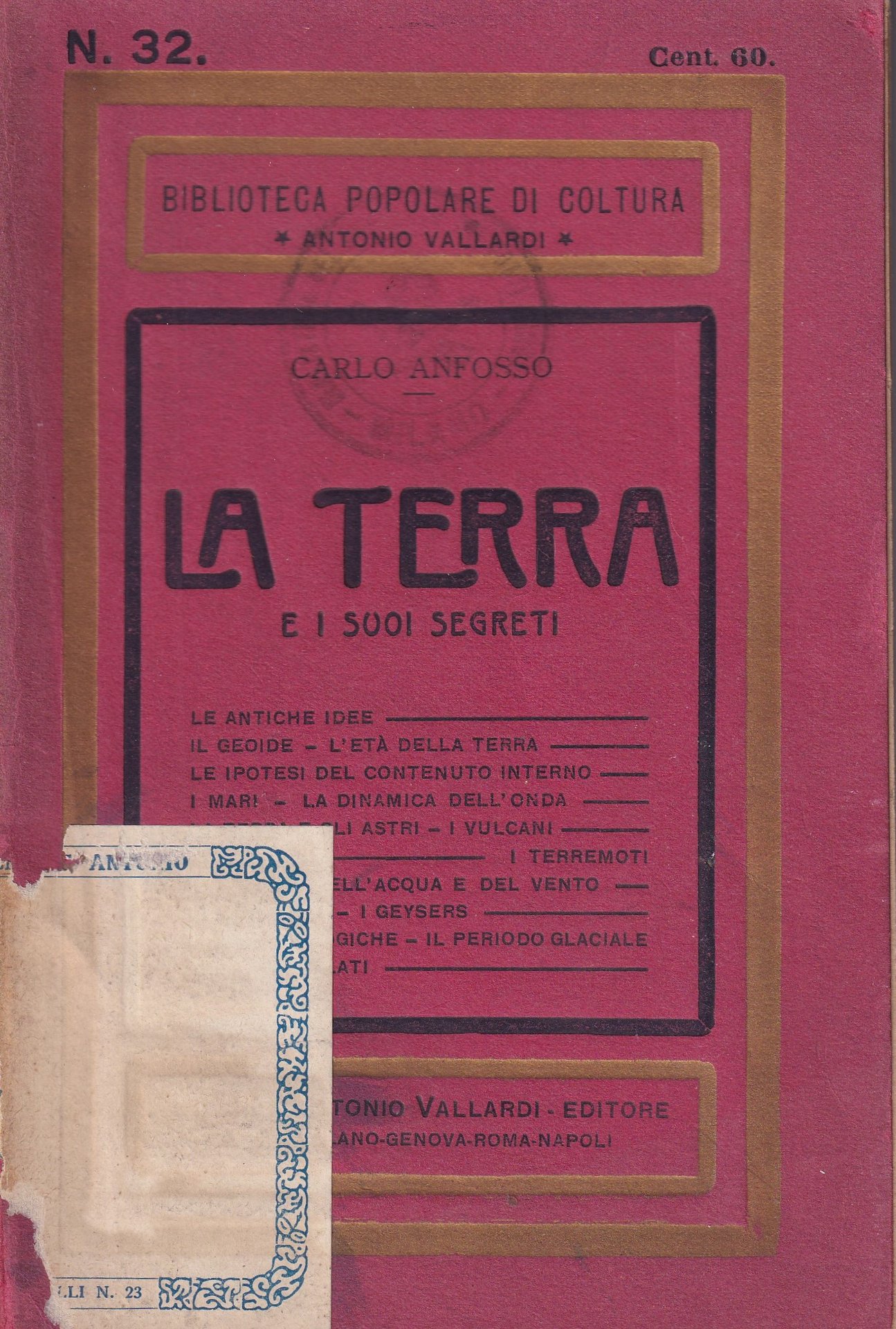 In 16°, br. edit. (adesivo bibl. parzialmente staccato alla br., timbretto di poss. prec. prop. al piatto ant.), pp. 159,(1), con ill. e incisioni b.n. n.t.; timbretto di poss. prec. prop. al frontesp. e a pag. 5,159; coll. "Biblioteca popolare di coltura. N. 32"; discreto es.