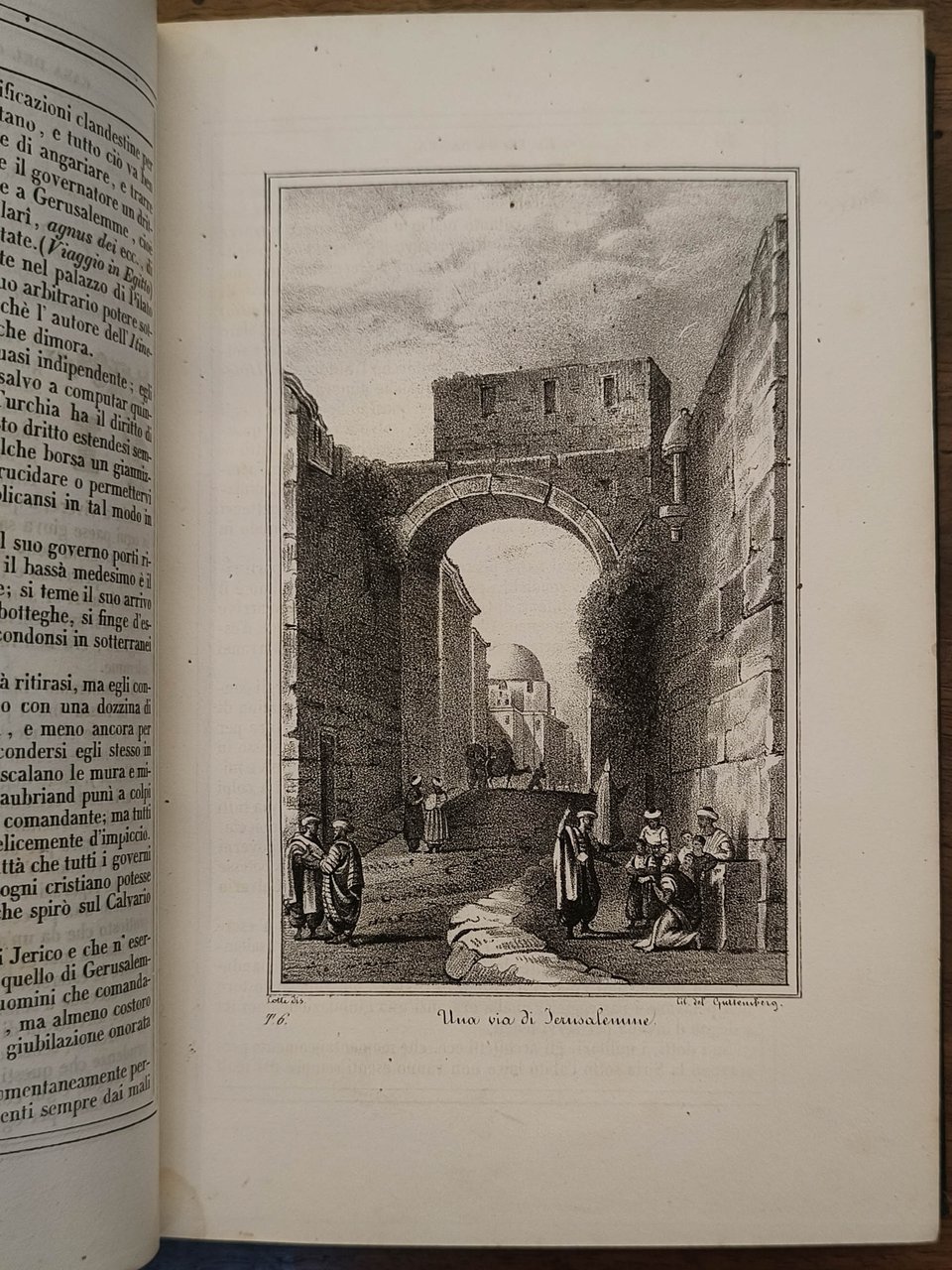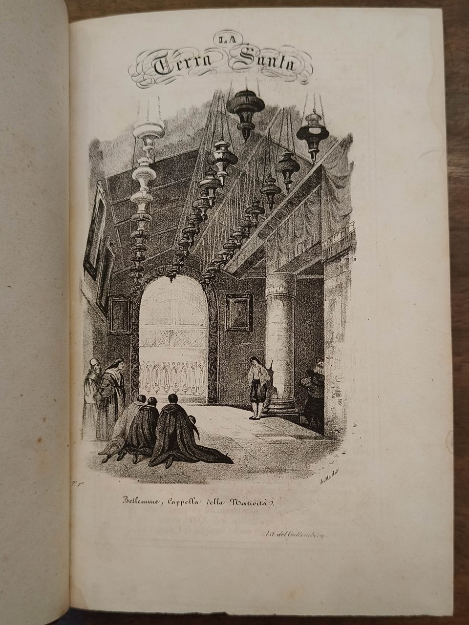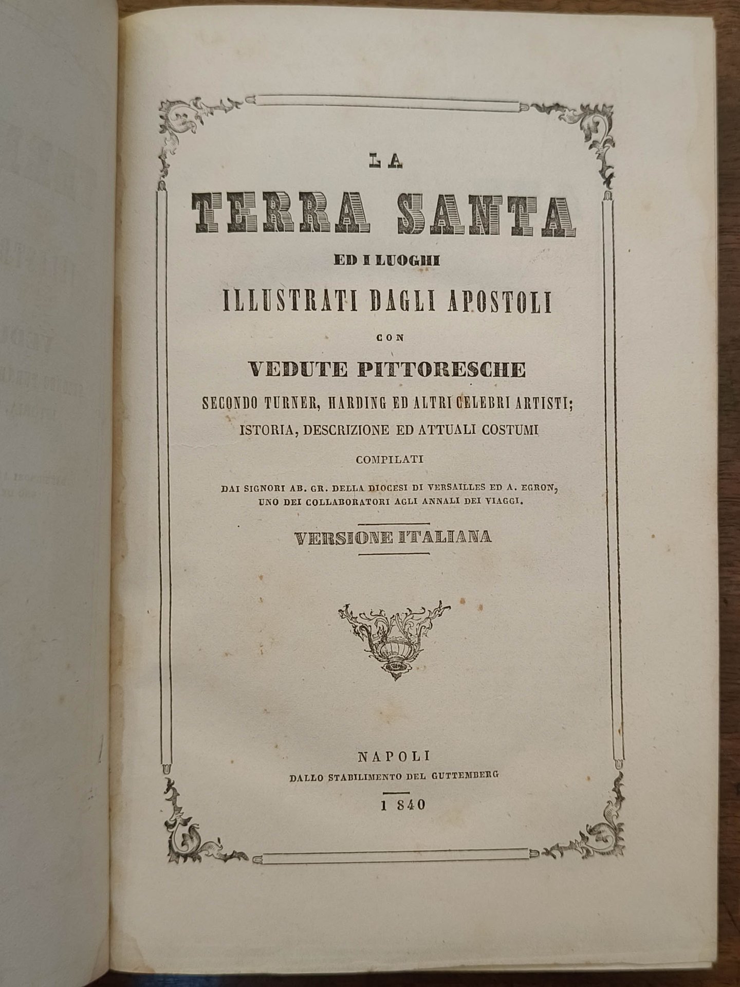 La Terra Santa ed i luoghi illustrati dagli apostoli: istoria, descrizione ed attuali costumi compilati dai sign. Ab. Gr. della diocesi di Versailles ed A. Egron, uno dei collaboratori agli annali deli viaggi; con vedute pittoresche secondo Turner, Harding ed altri celebri artisti, Napoli, dall stabilimento del Guttemberg, 1840. Cm 21,5. Pp. 317 (3). Legatura in mezza pelle, titolo e fregi in oro al dorso. Testo inquadrato in doppio filetto ornato da capilettera e bei finali figurati incisi su legno. Tagli macchiati. 48 tavole in litografia numerate fuori testo (tav. 40 mancante); vedute di monumenti e delle principali località della Palestina, Libano, Sinai, il Nilo e le Piramidi, Tebe, Babilonia, Ninive, Antiochia, Damasco, Cipro, Efeso, Rodi, Foro Romano e Colosseo.