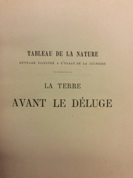 In-8 gr., mz. pelle coeva, dorso a cordoni con fregi a secco e titolo oro, pp. 504, ben illustrato da 25 "vues idéales de paysages de l'ancien monde" disegnati da Riou, 322 figure incise su legno di cui numerose a piena pagina e 8 carte geologiche colorate. Molto ben conservato.