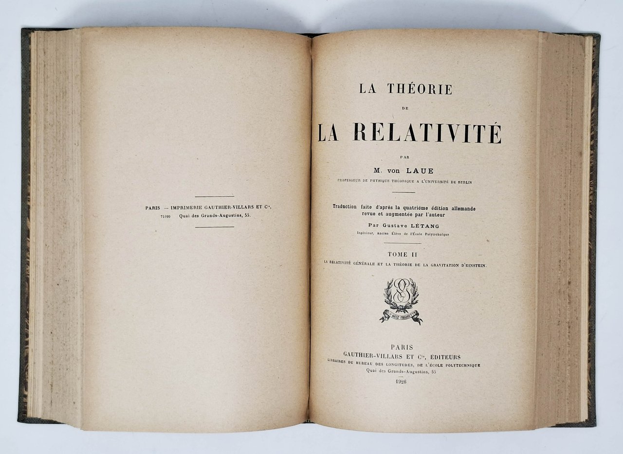 Opera completa in due tomi (Tome I: 'Le principe de relativité de la transformation de Lorentz', Tome II 'La relativité generale et la theoriede la gravitation d'Einstein') rilegati in un unico volume con coperta rigida in tutta tela e titolo in oro sul dorso. La copertina anteriore originale del primo tomo è conservata all'interno della rilegatura. Formato: 15,5 x 24 cm circa. Prima edizione francese: 'Traduction faite d'apres la quatrieme édition allemande revue et augmentee par l'auteur par Gustave Letang'. Pagine: XVI, 331; XVI, 318. Stato di conservazione: si segnala esclusivamente un piccolo taglio di natura editoriale sul margine bianco verticale del foglio che contiene le due pagine 205-206 ma, nel complesso, un esemplare molto buono. Privo di sottolineature, annotazioni, firme d'appartenenza, timbri o altri segni di penna o di matita. In lingua francese.Max Von Laue (1879 - 1960), allievo di Max Planck, fu insignito del Premio Nobel per la fisica nel 1912 per la scoperta della diffrazione dei raggi X. Nella presente opera si occupò di dimostrare che tramite la teoria della relatività di Albert Einstein è possibile dare una spiegazione al fenomeno della velocità di propagazione della luce nei fluidi in movimento, secondo la teoria di Fizeau.