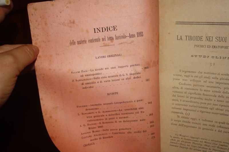 Codice 3097, , LA TIROIDE NEI SUOI RAPPORTI PSICHICI ED EMATOPEIETICI SALEMI PACE IL PISANI GAZZETTA SICULA ORGANO MANICOMIO DI PALERMO, , FASCICOLO 3 SETT DIC 1893, SULLO STATO MENTALE DI G.S. IMPUTATO DI OMICIDIO E DI VARIE LESIONI SU ALTRI DODICI INDIVIDUI, ETC., , FOXIL SPARSI SULLE COPERTINE
