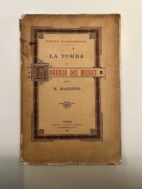 In 8 (cm 16,5 x 25), pp. 61 + (1 bianca) + XIV + (2) con 4 tavole fuori testo. Invio autografo manoscritto alla prima carta. Brossura editoriale con danni riparati al dorso e qualche mancanza ai piatti. Saggio sulla sepoltura di Lorenzo il Magnifico con la descrizione della Sagrestia della basilica di San Lorenzo a Firenze.