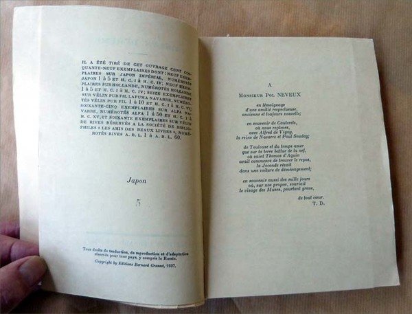 Paris, Grasset, 1937. Un volume broché de format petit in 8° carré de 288 pp. Sur Japon Impérial; non rogné, témoins, couverture illustrée. Edition Originale, un des 9 exemplaires en premier papier, celui-ci N°5 sur Japon Impérial. Bon état.