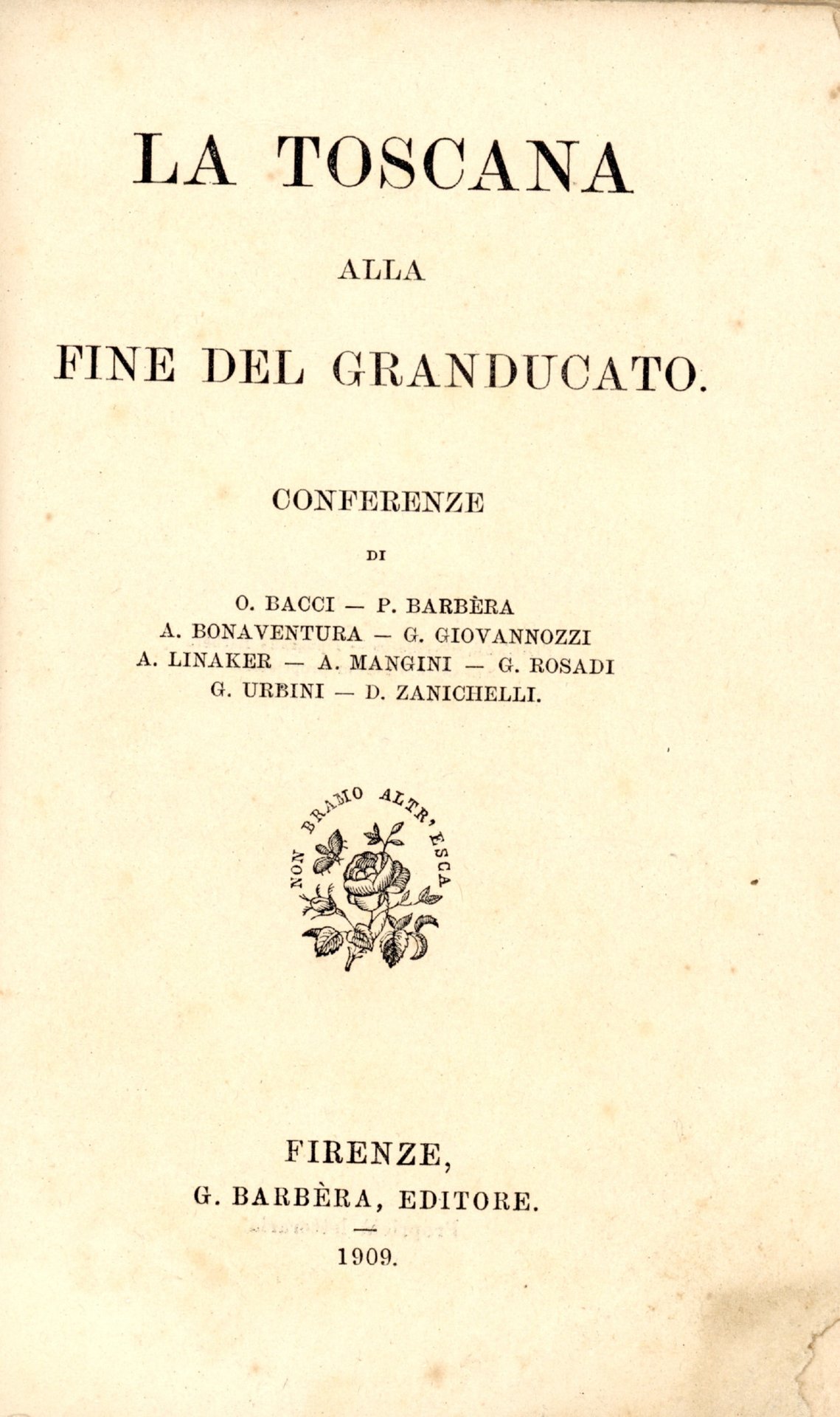 Conferenze di O. Bacci, P. Barbara, A. Bonaventura, G. Giovannozzi, A. Linaker, A. Mangini, G. Rosadi, G. Urbini, D. Zanichelli. XVI, 354 p. 18 cm. 945 - Ba Ottimo (Fine)