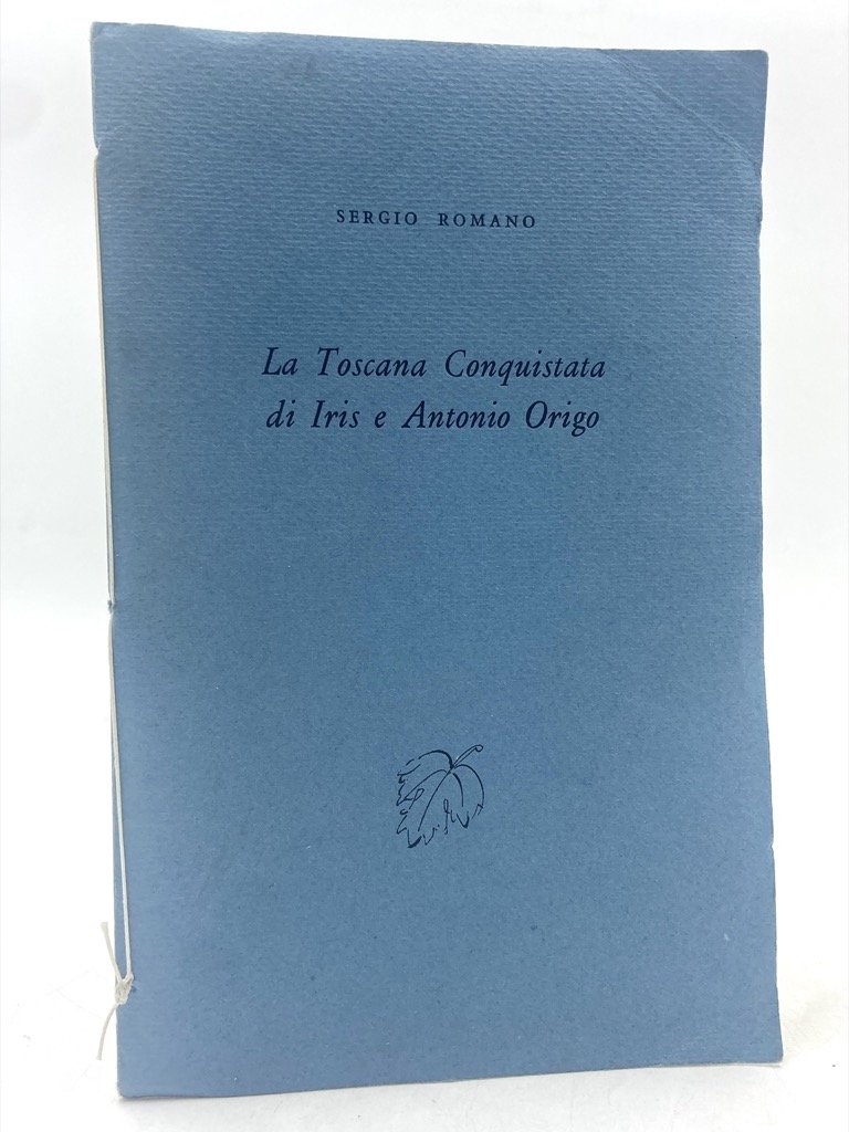 Brossura in cartoncino azzurro con titoli a stampa e cucitura a vista, cm 16.5 x 10.5, pp 14 (2) in carta vergata. Rara plaquette pubblicata per cura di Benedetta Origo ed Enzo Crea per gli Incontri in Terra di Siena - Sergio Romano dedica un breve ricordo alla scrittrice Iris Origo (1902-1988), al marito Antonio, alla tenuta La Foce e alla Val d’Orcia.