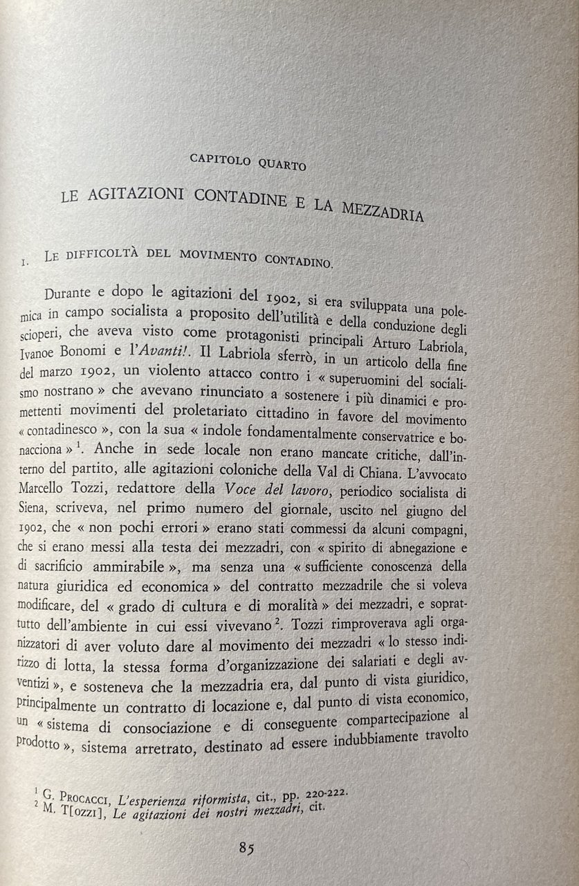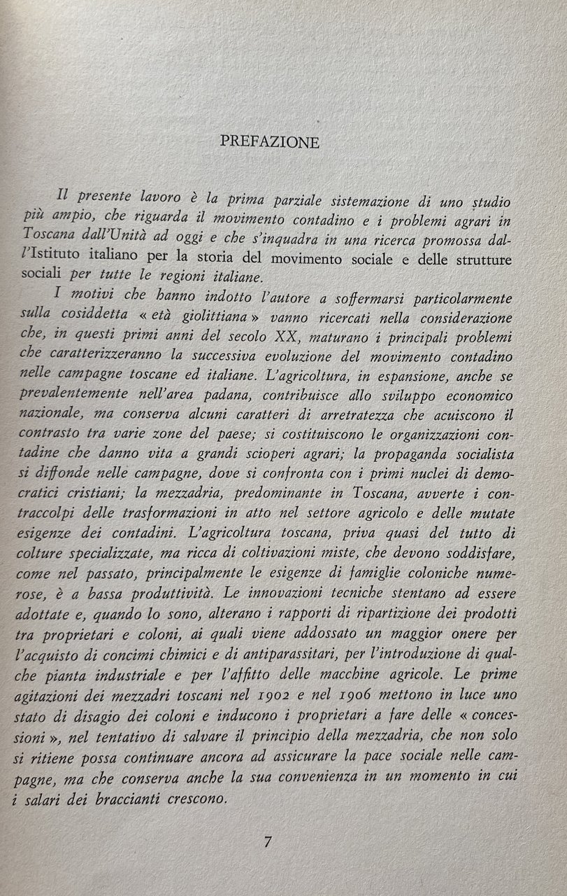 PREFAZIONE. Il presente lavoro è la prima parziale sistemazione di uno studio più ampio, che riguarda il movimento contadino e i problemi agrari in Toscana dall'Unità ad oggi e che s'inquadra in una ricerca promossa dall'Istituto italiano per la storia del movimento sociale e delle strutture sociali per tutte le regioni italiane. I motivi che hanno indotto l'autore a soffermarsi particolarmente sulla cosiddetta età giolittiana vanno ricercati nella considerazione che, in questi primi anni del secolo XX, maturano i principali problemi che caratterizzeranno la successiva evoluzione del movimento contadino nelle campagne toscane ed italiane. L'agricoltura, in espansione, anche se prevalentemente nell'area padana, contribuisce allo sviluppo economico nazionale, ma conserva alcuni caratteri di arretratezza che acuiscono il contrasto tra varie zone del paese; si costituiscono le organizzazioni contadine che danno vita a grandi scioperi agrari; la propaganda socialista si diffonde nelle campagne, dove si confronta con i primi nuclei di democratici cristiani; la mezzadria, predominante in Toscana, avverte i contraccolpi delle trasformazioni in atto nel settore agricolo e delle mutate esigenze dei contadini. L'agricoltura toscana, priva quasi del tutto di colture specializzate, ma ricca di coltivazioni miste, che devono soddisfare, come nel passato, principalmente le esigenze di famiglie coloniche numerose, è a bassa produttività. Le innovazioni tecniche stentano ad essere adottate e, quando lo sono, alterano i rapporti di ripartizione dei prodotti tra proprietari e coloni, ai quali viene addossato un maggior onere per l'acquisto di concimi chimici e di antiparassitari, per l'introduzione di qualche pianta industriale e per l'affitto delle macchine agricole. Le prime agitazioni dei mezzadri toscani nel 1902 e nel 1906 mettono in luce uno stato di disagio dei coloni e inducono i proprietari a fare delle concessioni, nel tentativo di salvare il principio della mezzadria, che non solo si ritiene possa continuare ancora ad assicurare la pace sociale nelle campagne, ma che conserva anche la sua convenienza in un momento in cui i salari dei braccianti crescono.