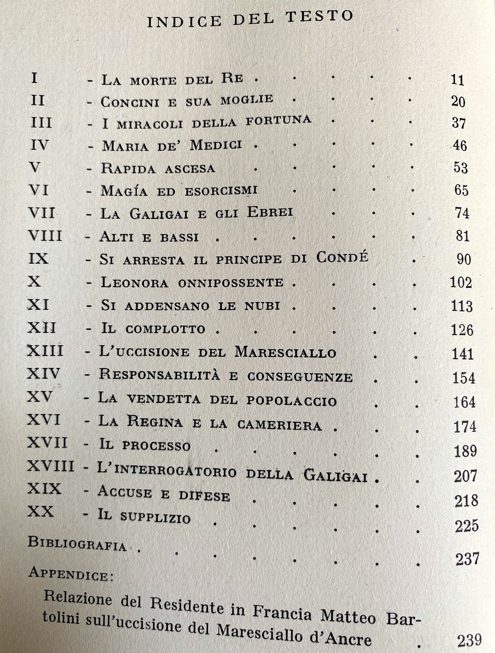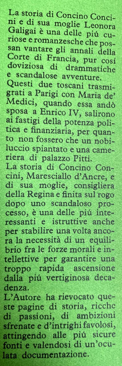 La storia di Concino Concini e di sua moglie Leonora Galigai è una delle più curiose e romanzesche che possano vantare gli annali della Corte di Francia, pur così doviziosa di drammatiche e scandalose avventure. Questi due toscani trasmigrati a Parigi con Maria de' Medici, quando essa andò sposa a Enrico IV, salirono ai fastigi della potenza politica e finanziaria, per quanto non fossero che un nobiluccio spiantato e una cameriera di palazzo Pitti. La storia di Concino Concini, Maresciallo d'Ancre, e di sua moglie, consigliera della Regina e finita sul rogo dopo uno scandaloso processo, è una delle più interessanti e istruttive anche per stabilire una volta ancora la necessità di un equilibrio fra le forze morali e intellettive per garantire una troppo rapida ascensione dalla più vertiginosa decadenza. L'Autore ha rievocato queste pagine di storia, ricche di passioni, di ambizioni sfrenate e d'intrighi favolosi, attingendo alle più sicure fonti e valendosi di un'oculata documentazione.