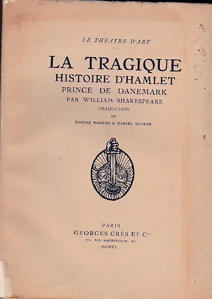 In-8°, pp. XXXI, 304, (2), brossura editoriale incamiciata con vignetta xilografica al piatto. Una xilografia a colori di Louis Jou all'antiporta. Fregi tipografici in xilografia n.t. disegnati e incisi da Jean Lébédeff. Minimali aloni al piatto, un restauro minimo alla cuffia inferiore. Bell'esemplare. Edizione originale della traduzione dell'Amleto' di Marcel Schwob ed Eugène Morand; esemplare n° 183 della tiratura di 1900 copie su papier de Rives. 'Théatre d'Art'.