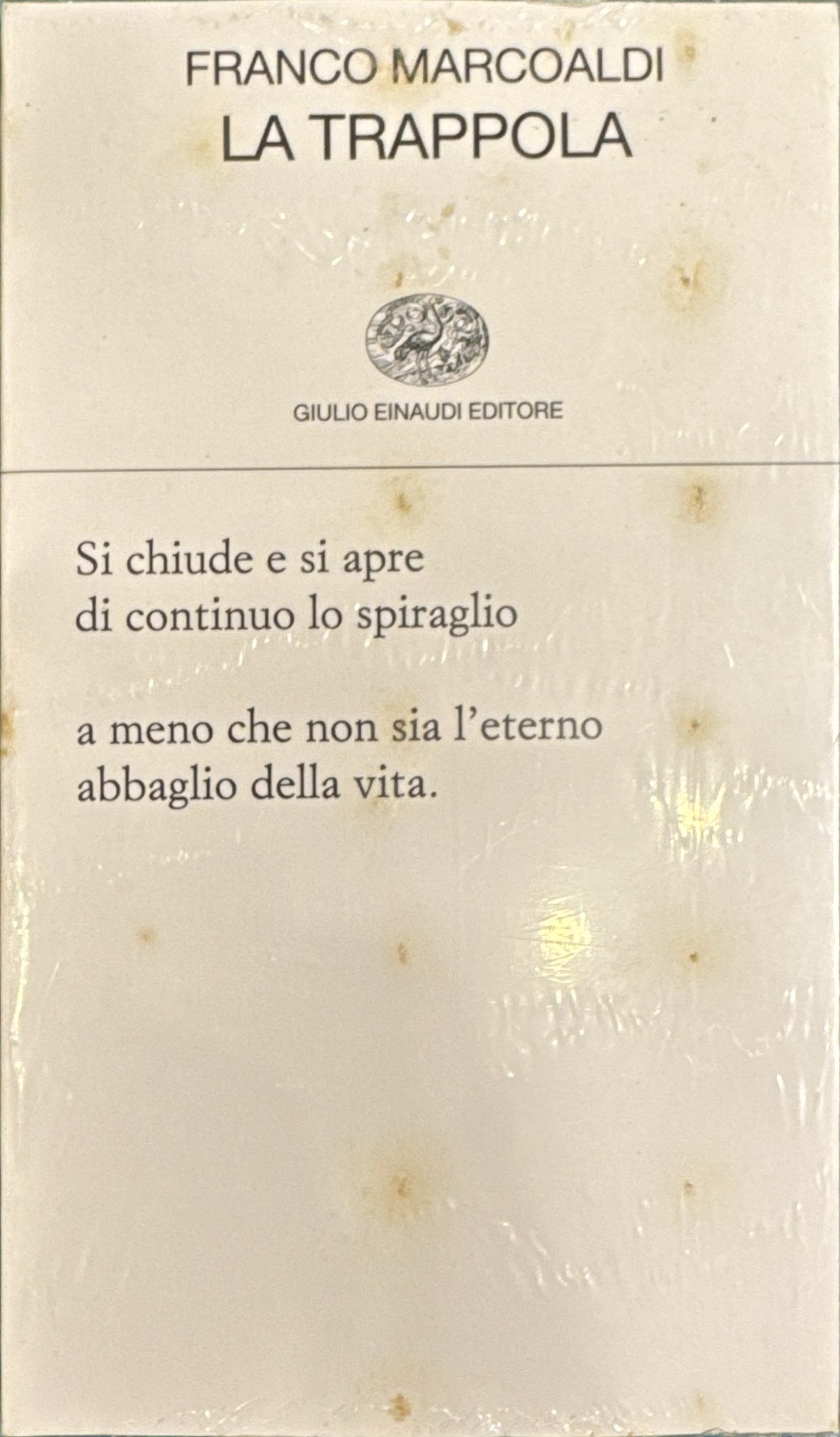 Compattezza tematica, potenza e duttilità della metafora, ritmo e sonorità a scatti, con accelerazioni e rallentamenti, ribattute e controtempi. Le caratteristiche tipiche della poesia di Marcoaldi risultano potenziate al massimo in questa sua nuova raccolta in cui la tradizione poetica europea si sposa con l'influenza della sapienza orientale e delle sue forme. Le trappole della vita sono ovunque, nelle leggi della natura, nella politica e anche nell'economia, che oggi più che mai domina il mondo. Ma sono soprattutto dentro la mente degli uomini. Hanno la forma di regole, meccanismi, abitudini, falsi obiettivi che provocano angoscia e allontanano dalle gioie più autentiche. Quasi componendo una piccola guida dei perplessi, i versi di questo libro smontano l'insieme degli artifici sociali con interrogazioni continue, epigrammi sospesi nel silenzio a catturare frammenti di energia da cui ripartire.// Cop. in brossura; Einaudi; copertina con segni di gora;prima di effettuare l'ordine domandare per fotografie