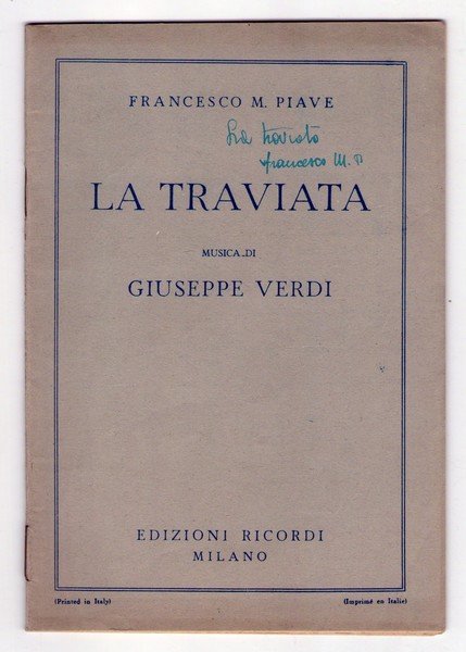 *LA TRAVIATA Musica di GIUSEPPE VERDI. Francesco M. Piave. - Riprisdtino 1945. Con firma al piatto.