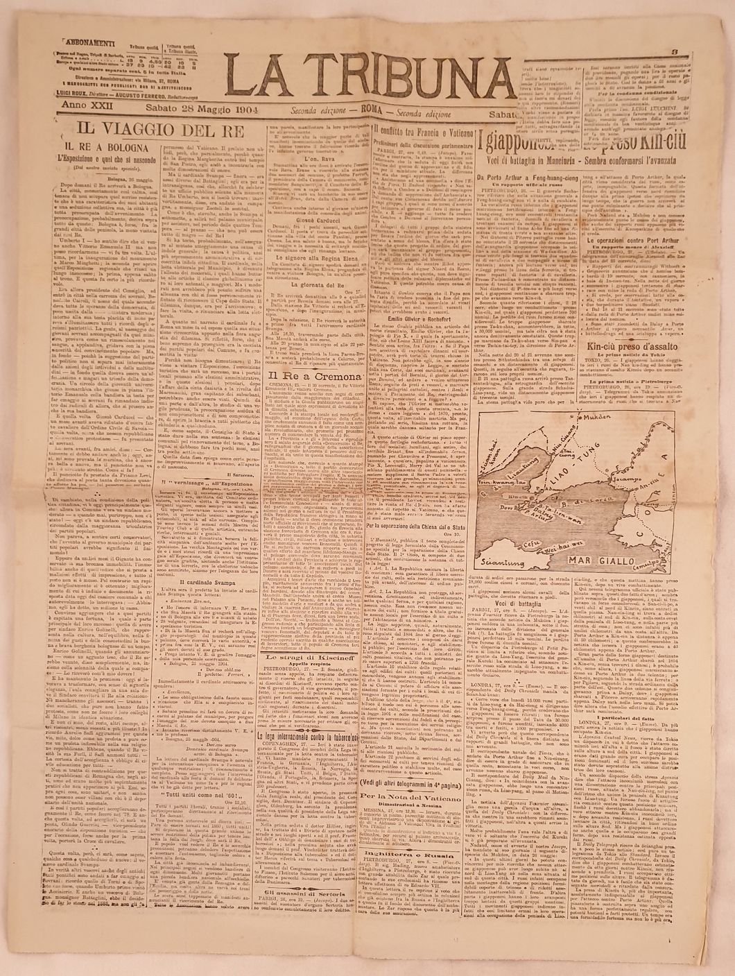 Numero del 28 maggio 1904 del quotidiano "La Tribuna" fondato a Roma nel 1883 dai politici Alfredo Baccarini e Giuseppe Zanardelli. Venne pubblicato fino al Novembre 1946.<BR>All'interno: Il viaggio del Re, I giapponesi presso Kin ciu, Il re a Cremona, Le stragi di Kiscineff, Il cardinale Svampa, Gli assassini di Sertoris, per la mostra di Ravenna, L'agitazione al porto di Genova, La morte dell'on. Finardi, Una poesia inedita di Giulio Orsini, Al porto di Napoli, Il distretto di Rosario nell'Argentina ecc. In buone condizioni. Raro. Brossura editoriale in buone condizioni generali con lievi usure ai margini e dorso. Piegature. Legatura assente. All'interno le pagine si presentano in buone condizioni con rare fioriture. Parte mancante alla prima pagina con perdita di testo. In folio. Dim. 60,5x45 cm. Pp. 6. Number of the 28th of may 1904 of the daily magazine "La Tribuna" established in Rome in 1883 by the politicians Alfredo Baccarini and Giuseppe Zanardelli. It was published until the november 1946.<BR>Inside: the travel of King, Japanese near Kin ciu, the King in Cremona, Kiscineff, the Cardinal Svampa, The murderers of Sertoris, for the exibiton of Ravenna, The riot in the harbour of Genoa, The death of on. Finardi, an inedit poem of Giulio Orsini, in the harbour of Napoli, Rosario in Argentina.<BR>In good conditions. Editorial cover in good general conditions slightly worn in the edges and spine. Foldings. Binding is missing. Inside pages are in good conditions with occasional foxings. Missing part in the first page with loss of text. In folio. Dim. 60,5x45 cm. Pp. 6.