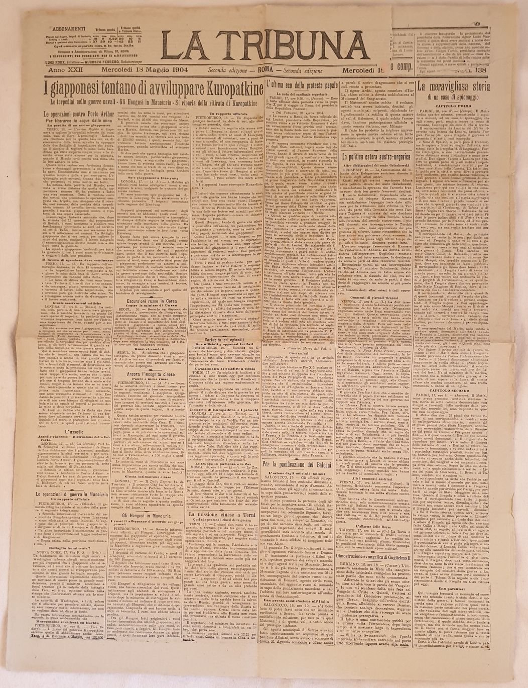 Numero del 18 maggio 1904 del quotidiano "La Tribuna" fondato a Roma nel 1883 dai politici Alfredo Baccarini e Giuseppe Zanardelli. Venne pubblicato fino al Novembre 1946.<BR>All'interno: I giapponesi tentano di avviluppare Kuropatkine, La politica estera austro ungarica, Escursioni russe in Corea, Per la pacificazione dei Balcani, La missione cinese a Terni, la gara musicale di Milano, Dopo la grandinata sui Colli Laziali, situazione di oggi a Cerignola, Processo Nasi, Relazione Arlotta sulla marina ecc. In buone condizioni. Raro. Brossura editoriale in buone condizioni generali con lievi usure ai margini e dorso. Piegature. Legatura assente. All'interno le pagine si presentano in buone condizioni con rare fioriture. Parte mancante alla prima pagina con perdita di testo. In folio. Dim. 60,5x45 cm. Pp. 6. Number of the 18th of may 1904 of the daily magazine "La Tribuna" established in Rome in 1883 by the politicians Alfredo Baccarini and Giuseppe Zanardelli. It was published until the november 1946.<BR>Inside: Japanese try to keep Kuropatkine, Foreign austrian Hungaric policy, Russian excursions in Korea, Balcans, Chinese mission in Terni, musical prize in Milan, Colli Laziali, situation in Cerignola, Nasi Trial, Report Arlotta on sea army etc. In good conditions. Editorial cover in good general conditions slightly worn in the edges and spine. Foldings. Binding is missing. Inside pages are in good conditions with occasional foxings. Missing part in the first page with loss of text. In folio. Dim. 60,5x45 cm. Pp. 6.