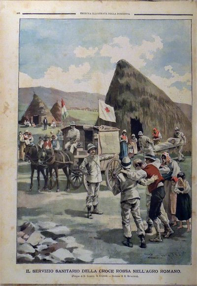 In-folio, pp. 8, (da 225 a 232), con due ill. a col. a piena pag. raffiguranti "La partenza dei bersaglieri per la Cina. La grande dimostrazione alla stazione di Roma" e "Il servizio sanitario della Croce Rossa nell'Agro Romano". All'interno articoli riguardanti: "Corriere militare: Il telestim, nuovo misuratore delle distanze - Ferrovia militare costruita in trenta giorni - Come si vince una battaglia - Gli automobili negli eserciti"; "Ritrovi estivi: Le capanne di Roma"; "La campagna antimalarica della Croce Rossa nell'Agro Romano"; "Il conflitto cinese. I bersaglieri partiti da Roma il 14 luglio", con 6 ill. fot. raffig. "G. Capoani, L. Agliardi, G. Sibilla", "S. Cordinovis, G. B. Servici, A. Angiolini, E. Tonolo", "Primo plotone e tenente A. Angiolini", "Secondo plotone e tenente E. Tonolo", "Terzo plotone e tenente A. Gillio", "Quarto plotone e tenente S. Cordinovis"; In cucina: Braciolette al riso - Polpettone di carne". Fascicolo completo proveniente da rilegatura.