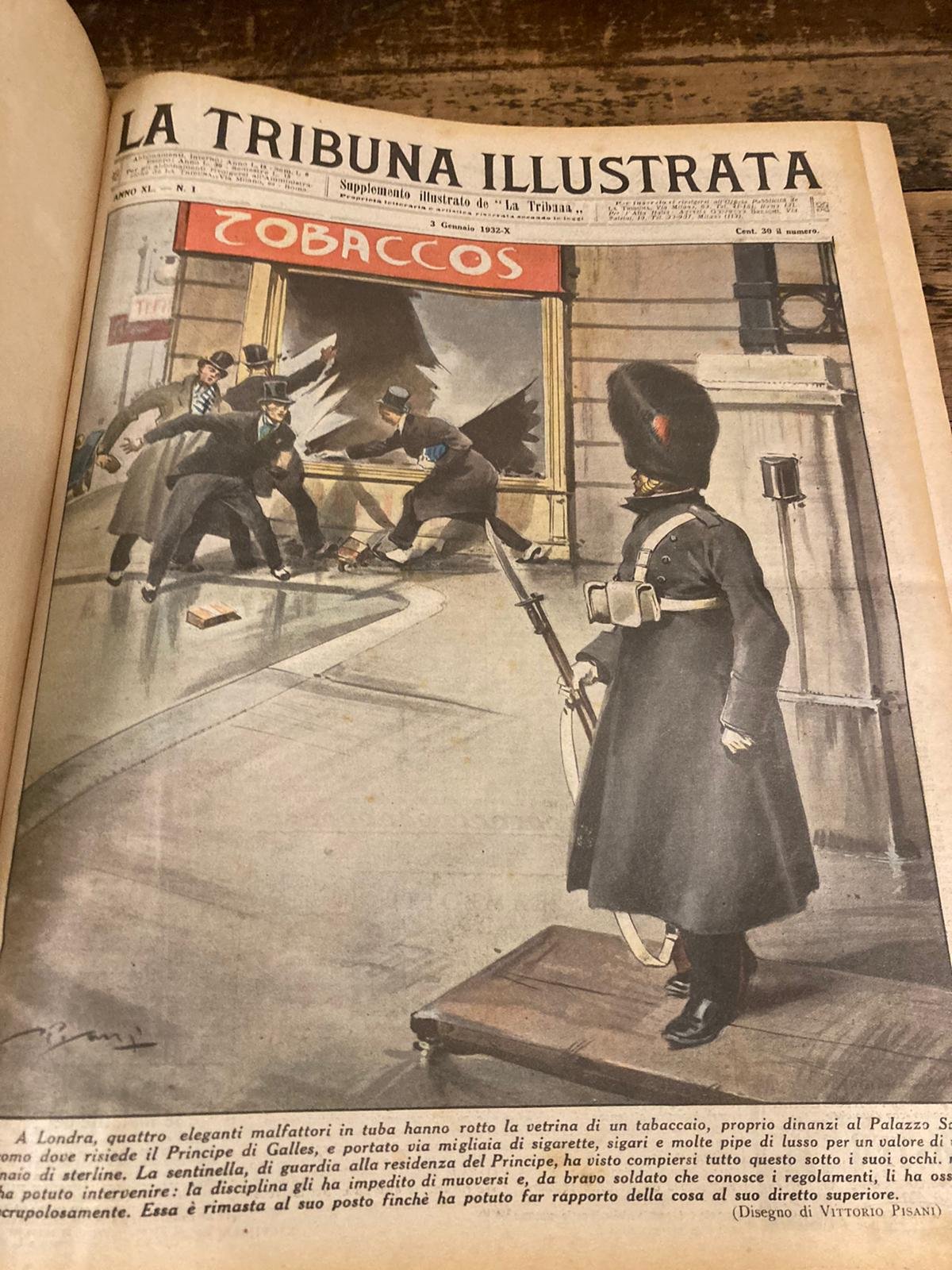 Annata completa 1932 di questo settimanale nato come supplemento illustrato de 'La Tribuna'. 52 numeri in un vol. in-4° grande legato in mezza tela rossa coeva con titolo in nero al dorso. Interamente illustrato in nero e a colori e con numerose pubblicità n.t.