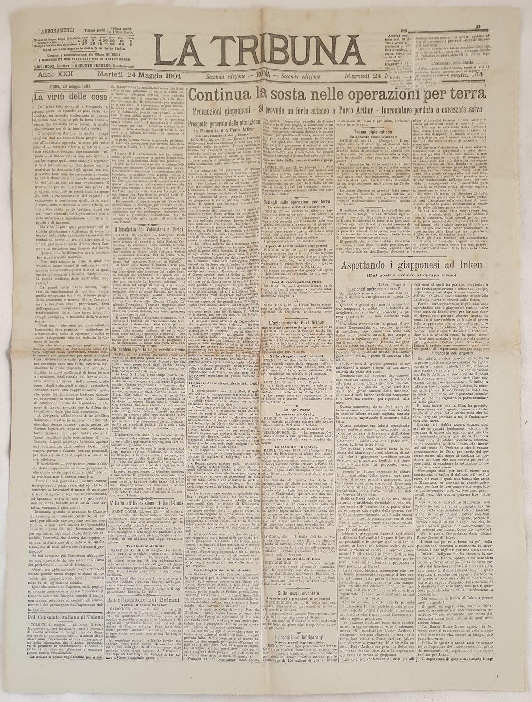 Numero del 24 maggio 1904 del quotidiano "La Tribuna" fondato a Roma nel 1883 dai politici Alfredo Baccarini e Giuseppe Zanardelli. Venne pubblicato fino al Novembre 1946.<BR>All'interno: Continua la sosta nelle operazioni per terra, aspettando i giapponesi ad Inkeu, Il banchetto dei valdostani a Parigi, Proprietari e contadini a Cerignola, L'ossario di Montebello, I carabinieri italiani a Creta, La regina muore a Siena, L'emigrazione negli Stati Uniti e Canada ecc.<BR>In buone condizioni. Raro. Brossura editoriale in buone condizioni generali con lievi usure ai margini e dorso. Piegature. Legatura assente. All'interno le pagine si presentano in buone condizioni con rare fioriture. Parte mancante alla prima pagina con perdita di testo. In folio. Dim. 60,5x45 cm. Pp. 6. Number of the 24th of may 1904 of the daily magazine "La Tribuna" established in Rome in 1883 by the politicians Alfredo Baccarini and Giuseppe Zanardelli. It was published until the november 1946.<BR>Inside: waiting japanese in Inkeu, Il banchetto dei valdostani a Parigi, Owners and peasants in Cerignola, bones in Montebello, Italian carabinieri in Creta, The queen dies in Siena, Emigration in United States and Canada. In good conditions. Editorial cover in good general conditions slightly worn in the edges and spine. Foldings. Binding is missing. Inside pages are in good conditions with occasional foxings. Missing part in the first page with loss of text. In folio. Dim. 60,5x45 cm. Pp. 6.