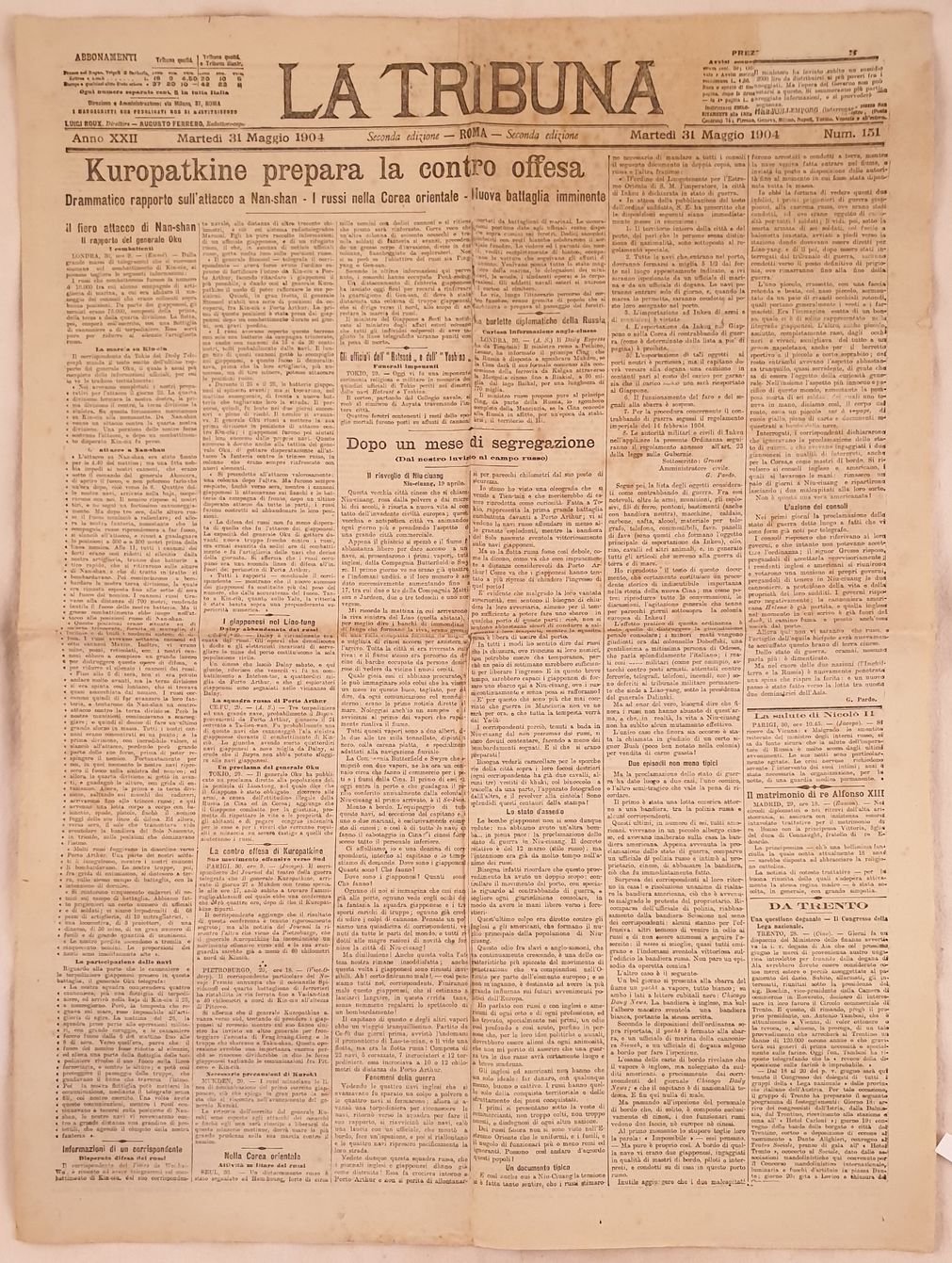 Numero del 31 maggio 1904 del quotidiano "La Tribuna" fondato a Roma nel 1883 dai politici Alfredo Baccarini e Giuseppe Zanardelli. Venne pubblicato fino al Novembre 1946.<BR>All'interno: Kuropatkine prepara la contro offesa, dopo un mese di segregazione in un campo russo,da Trento una questione doganale, Lo sciopero di Torre Annunziata, Pei fatti di Cerignola, Il re da Brescia a Cremona, Dimissioni dell'On. Bagnasco, Societa Eritrea per le miniere d'oro, L'archivio Orsini all'asta ecc. In buone condizioni.<BR>Raro. Brossura editoriale in buone condizioni generali con lievi usure ai margini e dorso. Piegature. Legatura assente. All'interno le pagine si presentano in buone condizioni con rare fioriture. Parte mancante alla prima pagina con perdita di testo. In folio. Dim. 60,5x45 cm. Pp. 6. Number of the 31st of may 1904 of the daily magazine "La Tribuna" established in Rome in 1883 by the politicians Alfredo Baccarini and Giuseppe Zanardelli. It was published until the november 1946.<BR>Inside: Kuropatkine, after a month of segregation in a russian camp, from Trento an issue of borders, The strike of Torre Annunziata, Cerignola, The King from Brescia to Cremona, Dismissions of On. Bagnasco, Societa Eritrea for golden mines, OrsiniArchive at auction. In good conditions. Editorial cover in good general conditions slightly worn in the edges and spine. Foldings. Binding is missing. Inside pages are in good conditions with occasional foxings. Missing part in the first page with loss of text. In folio. Dim. 60,5x45 cm. Pp. 6.