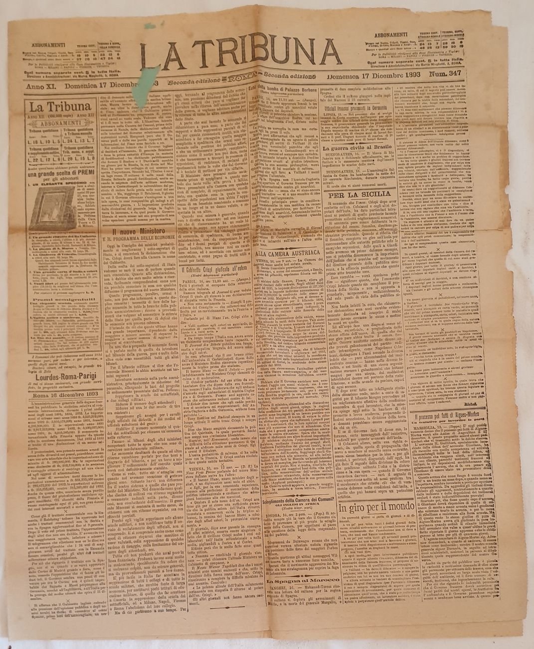 Numero del 17 dicembre 1893 del quotidiano "La Tribuna" fondato a Roma nel 1883 dai politici Alfredo Baccarini e Giuseppe Zanardelli. Venne pubblicato fino al Novembre 1946.<BR>All'interno: Il nuovo Ministero e il programma delle economia, Il Gabinetto Crispi giudicato all'estero, la guerra civile al Brasile, Per la Sicilia, Il processo pei fattidi Aigues Mortes, Roma: l'omicidio di stanotte alla Storta, Il massacro di Giardinello ecc.<BR>In buone condizioni. Raro. Brossura editoriale in buone condizioni generali con lievi usure ai margini e dorso. Piegature. Legatura assente. All'interno le pagine si presentano in buone condizioni con rare fioriture. Forellino all'ultima pagina. In folio. Dim. 56,5x45,5 cm. Pp. 4. Number of the 17th of december 1893 of the daily magazine "La Tribuna" established in Rome in 1883 by the politicians Alfredo Baccarini and Giuseppe Zanardelli. It was published until the november 1946.<BR>Inside: The new Ministery and the programme of economy, The Gabinet Crispi judges in the foreign countries, ciovil war to Brasil, For Sicily,Trial of Aigues Mortes, Rome: murder of Storta,Giardinello.<BR>In good conditions. Editorial cover in good general conditions slightly worn in the edges and spine. Foldings. Binding is missing. Inside pages are in good conditions with occasional foxing. In folio. Dim. 56,5x45,5 cm. Pp. 4.