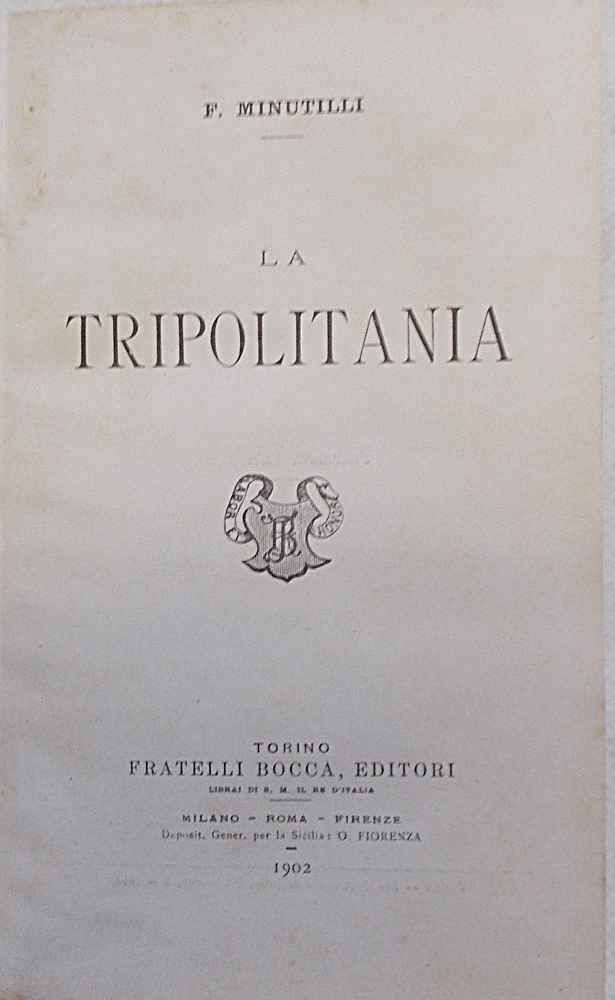 In 8° (cm. 20 x 12); pagg. VIII, 438; con 1 cartina ripiegata f.t.; ottima mezza pelle dell'epoca con titoli e fregi oro al dorso. Qualche sottolineatura a matita. VG. ** Edizione originale, molto meno facile a reperirsi rispetto a quella del 1912. La più nota e apprezzata monografia geografica dell'epoca. Minutilli è stato uno dei maggiori conoscitori della storia e della geografia della Libia e redasse in seguito la "Bibliografia della Libia". Contiene: la Tripolitania e l'antica Libia; gli abitanti; governo, religione, vita sociale.; importanza della Tripolitania per gli italiani; la Tripolitania propria; il Sahara tripolitano; la Sirtica o Sort; le oasi del deserto Sirtico; la Cirenaica, la Marmarica; le oasi del deserto Libico; il Fezzan; i Tuareghi della Tripolitania; il paese dei Tuareghi.