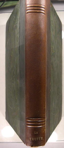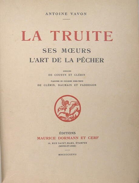Editions Maurice Dormann et Cerf, 1927. Grand In/4 (33 x 25 cm), couvertures imprimée en noir et rouge avec vignette centrale (martin pêcheur), reliure en demi-chagrin marron, dos à 6 nerfs sur le haut et le bas du dos, 377 pages. Edition Originale. Exemplaire numéroté sur papier Dujardin avec la Signature de l'auteur. Illustré de 71 figures en noir dans le texte et 11 superbes planches en couleurs h.-texte avec serpentes, de Clérin, Daumain, Faddegon. Tirage limité à 650 exemplaires numérotés. Edition originale de ce chef-d'oeuvre de littérature halieutique, le plus beau livre jamais publié sur la pêche de la Truite. Gomendy, p. 185-186.