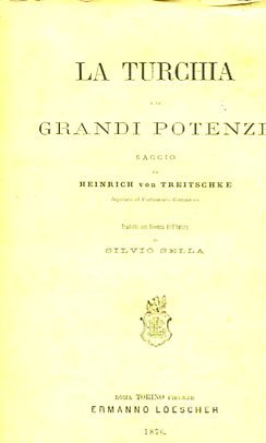In-8°, pp. 69, (3), brossura editoriale gialla. Perfetto esemplare a fogli chiusi. Prima edizione italiana di questa disamina del grande storico e pensatore politico tedesco, precursore del pangermanesimo, sulle relazioni politiche e diplomatiche fra la Turchia e le maggiori potenze europee, e sui delicati equilibri intorno ad esse. L'edizione originale tedesca era apparsa nel fascicolo del 28 giugno 1876 del 'Preussische Jahrbücher'. 'La situazione presente non dà luogo a gravi timori, ma esige seria vigilanza, perchè d'improvviso dagli affari orientali potrebbe sorgere la questione, se noi Tedeschi siam pronti a difendere i frutti del 1870'.