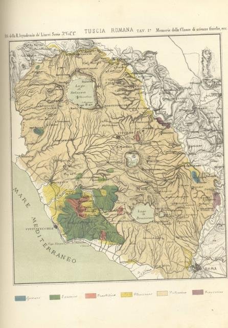 Memoria letta nelle sedute della primavera 1877 della Reale Accademia dei Lincei. Cm.30,7x22,4. Pg.54. Brossura editoriale. Esemplare parzialmente intonso. Fuori testo due carte a colori: "la Tuscia romana" e in grande formato il particolare della "Tolfa" con notazioni geologiche, tratte dagli Atti della R. Accademia de' Lincei Serie 3ª Vol. 1. > > "Bibliografia geologica e paleontologica della Provincia di Roma", 229. Codice libreria 138484.