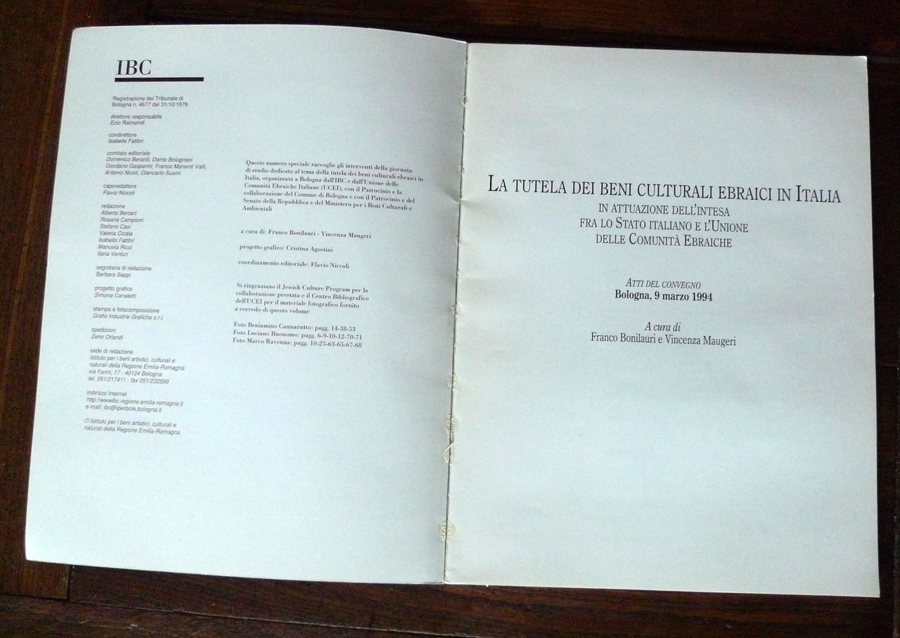 LA TUTELA DEI BENI CULTURALI EBRAICI IN ITALIA.In attuazione dell'intesa fra lo Stato Italianoe l'Unione delle Comunità Ebraiche.ATTI DEL CONVEGNO,Bologna, 9 marzo 1994.A cura di Franco Bonilauri e Vincenza Maugeri.IBC Istituto Beni Culturali / Grafis Industrie Grafiche,Casalecchio di Reno (BO) 1996,brossura, 30x23 cm., pp.71,illustrazioni fotografiche in bianco e nero,peso: g.500cod.9992CONDIZIONI DEL LIBRO: ottime