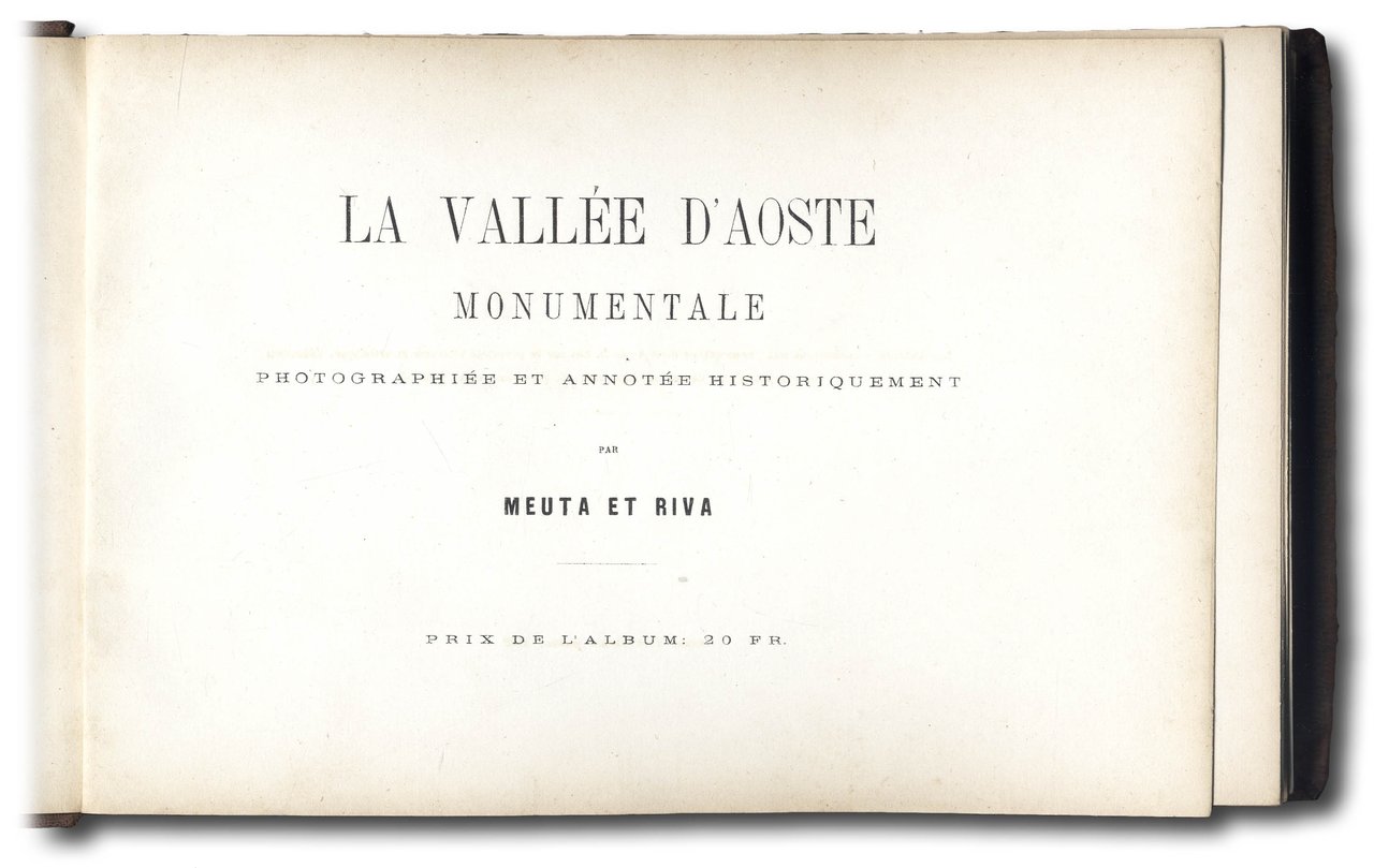 Pochissime notizie si hanno dei due fotografi Meuta e Riva: Miraglia, Culture fotografiche e società a Torino, a p. 399: “La ditta di Strambino si presenta all'Esposizione di Milano del 1894 con un esposimetro foggiato su quello del Watkins di Londra” e a p. 44 accenna al presente album: “L'indagine dedicata alla Valle d'Aosta dal volume La Vallée d'Aoste monumentale photographiée, così prossimo all'acceso referenzialismo descrittivo delle incisioni di E.Aubert del 1860, coniuga varie istanze parallele: l'amore per le montagne, la passione – auspice Quintino Sella – per l'alpinismo, il brivido per il sublime e l'orrido di un Giuseppe Giacosa", e ancora ‘l'invenzione di un Piemonte che si stava promuovendo a nazionalmente egemone, e che, nella Valle d'Aosta, scopriva, quasi a riequilibrare la dilatazione delle frontiere, le proprie radici e la propria identità di fondo' (quest'ultima citazione di Edoardo Sanguineti in La Valle d'Aosta: immagini del XIX secolo dagli archivi Alinari, 1985). La conservazione interna è buona, le fotografie fresche e nitide, qualche fioritura nei margini dei fogli di testo.