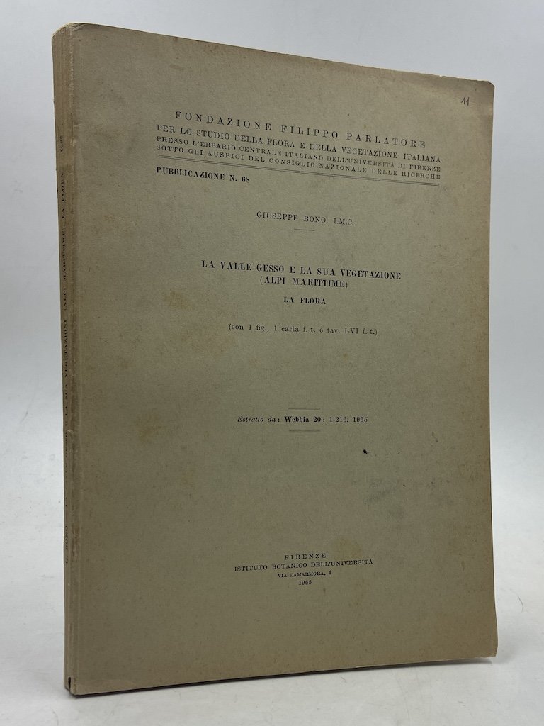 Corposo estratto in brossura, cm17x24, pp 216, 6 tavole patinate in nero, una cartina in nero ripiegata. Pubblicazione N. 68 della Fondazione Filippo Parlatore per lo studio della flora e ella vegetazione italiane presso l'Erbario Centrale Italiano dell’Università di Firenze sotto gli auspici del Consiglio Nazionale delle Ricerche. Dettagliato studio della vegetazione nelle zone di Valdieri, Entraque, e le valli del Torrente Gesso, qui pubblicato in volume e apparso sul numero 1 del ventesimo volume di Webbia, la rivista di tassonomia e geografia botanica fondata da Ugolino Martelli a Firenze nel 1905 e intitolata alla memoria del botanico Philip Barker Webb. Padre Giuseppe Bono, dell’Istituto Missioni Consolata, compì estesi studi floristici in Venezuela, Africa, sulle Alpi Marittime, in Valsesia, in Sardegna; l’enorme collezione di campioni raccolti dallo studioso è oggi conservata presso l’Erbario Tropicale di Firenze e il Museo di Scienze Naturali di Torino).