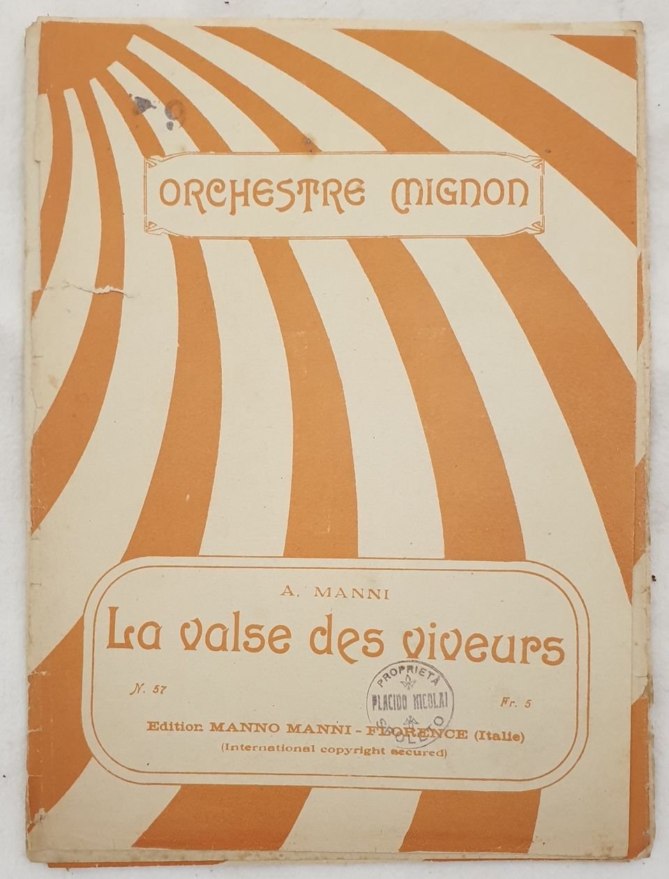 Partitura completa per orchestra degli anni '30 della melodia di A. Manni "La valse des viveurs".<BR>Copertina morbida editoriale. GENERE: Valzer STRUMENTI: pianoforte, violini; cello, basso, tromba, clarino, flauto, batteria ANNO: anni '30 DIMENSIONI: In 8. cm 23,5x17<BR>PAGINE: pp. 10 CONDIZIONI: Buone condizioni. Ex libris in copertinaComplete score for orchestra of 1930's of the melodies of A. Manni "La valse des viveurs". Editorial soft cover. MUSIC: Waltz STRUMENTI: piano, violin; cello bass, trumpet, clarion, flute, drums<BR>YEAR: 1930's SIZE: In 8. cm 23,5x17 PAGES: pp. 10 CONDITIONS: Good conditions. Ex libris in the cover <BR><BR>