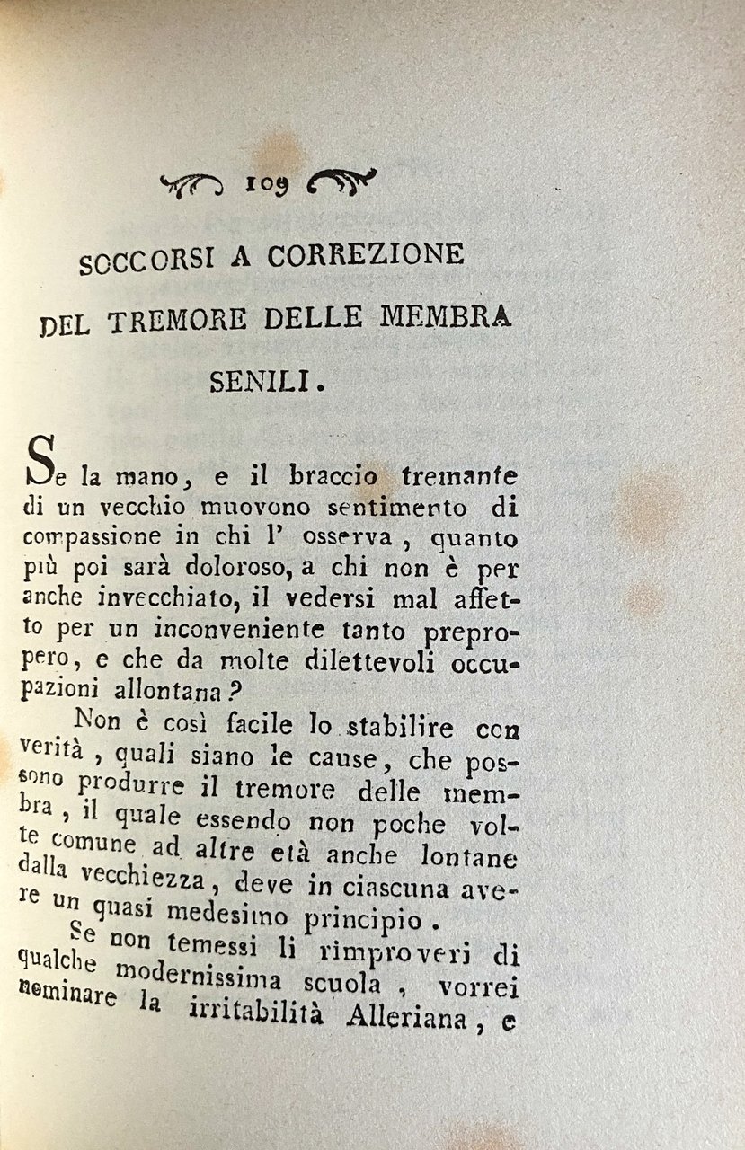 Ciascuno ha costantemente sott' occhio non pochi esempi di vecchiezza: alcuni ne sentono il peso, e ne provano li molesti accompagnamenti: ma pochissimi riflettono abbastanza su le vicende della medesima per farsene poi un oggetto di seria applicazione, e di studiata ricerca, la quale conduca alla conoscenza delle cause di esse, cioè di quelle azioni necessarie, che nascono con noi, che poco a poco si sviluppano, e che finalmente fanno comparsa non equivoca, ed hanno seco il corredo di molteplici inevitabili combinazioni, che possono bensì raddolcirsi, ma che non mai o sospendersi, o togliersi affatto alla indagine delle cause, e degli accompagnamenti dell'ultima età, aggiungere si devono le accorte diligenze dirette a minorare l' azione delle prime, e ad impiacevolire la forza dei secondi, per rendere in appresso più tollerabile, e men breve la vecchiezza. Quest' è lo scopo, che mi prefiggo nel presente opuscolo.