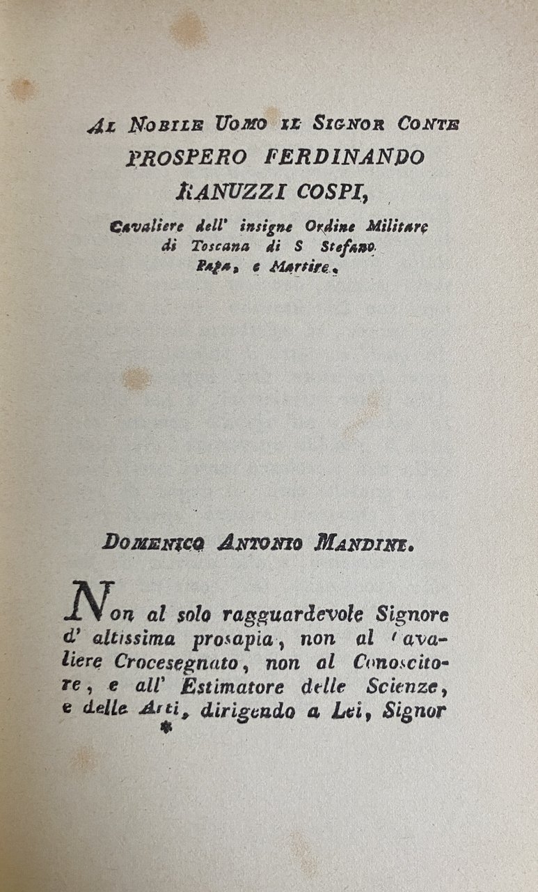 Autore: Domenico Antonio Mandini (Pubblico Professore, Accademico dell'Instituto delle Scienze, e Medico dell'Ospitale Azzolini detto della Maddalena).