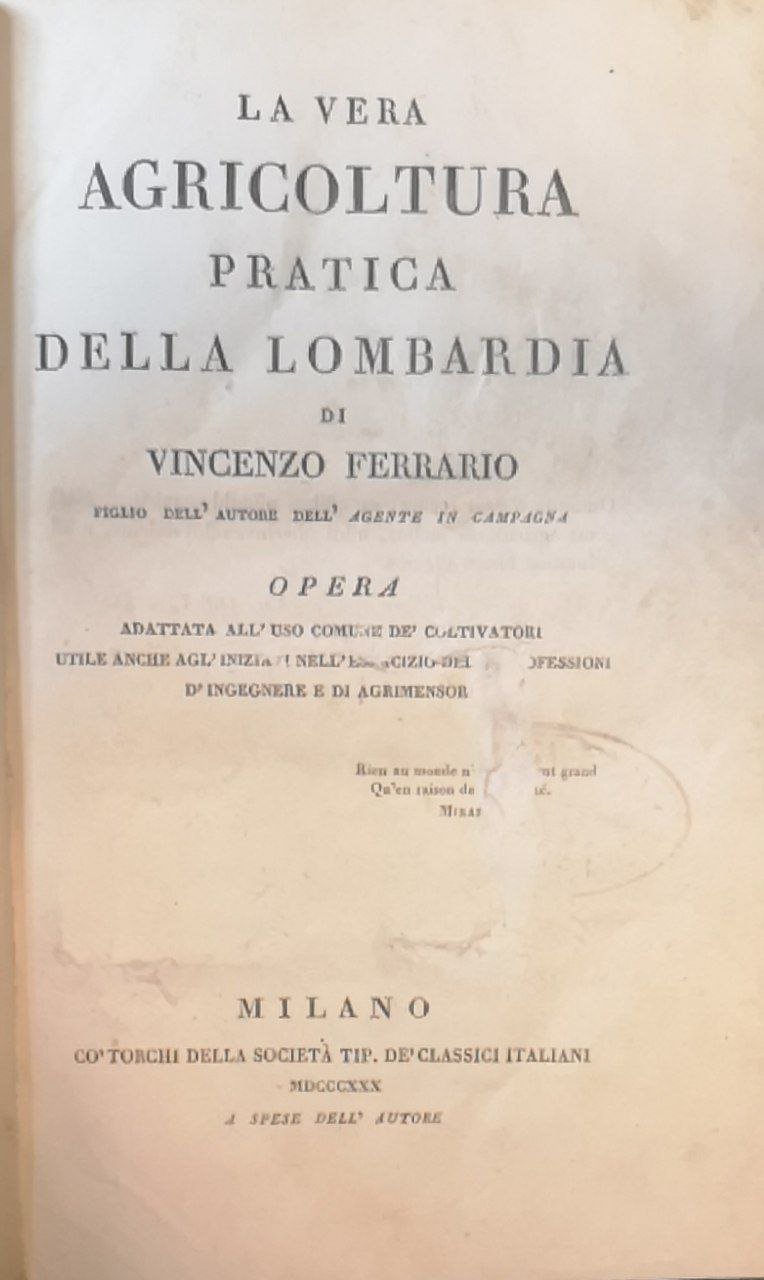 La vera agricoltura pratica della Lombardia di Vincenzo Ferrario figlio dell'autore dell'Agente in campagna. Opera adattata all'uso comune de' coltivatori utile anche agl'iniziati nell'esercizio delle professioni d'ingegnere e di agrimensore.