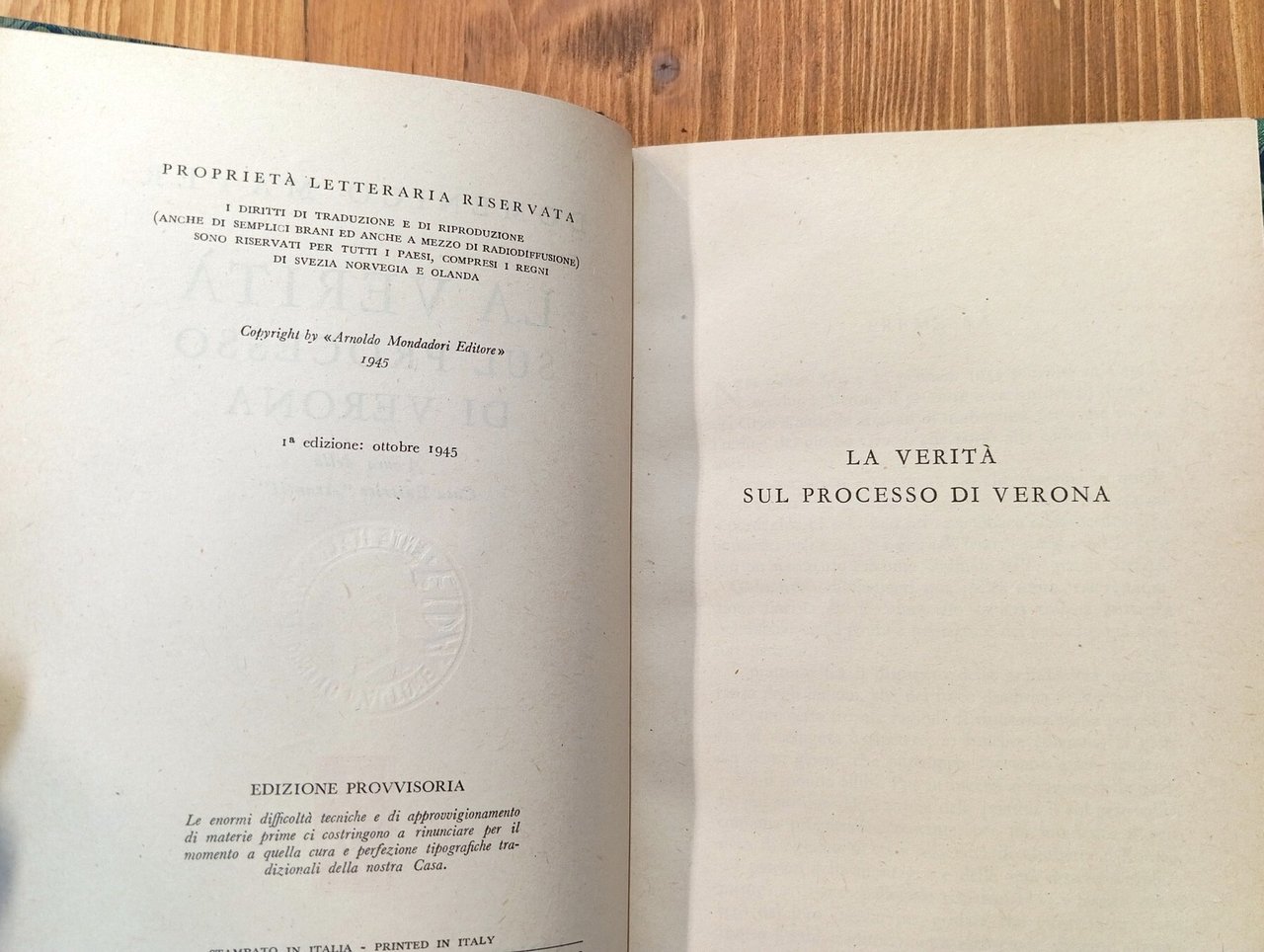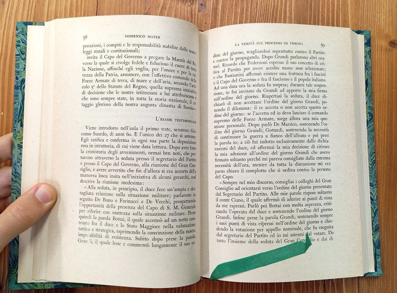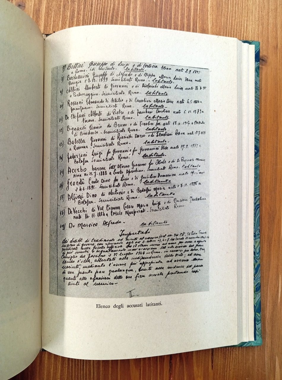 Prima edizione dell'ottobre 1945 - Volume rilegato in mezza pelle verde oliva con nervatura, titolo e fregio oro al dorso che riporta restauri per spellature e per una fessura alla cerniera del piatto anteriore; piatti marezzati così come i fogli di guardia; 164 pagine con , a seguire, numerose tavole fotografiche dei documenti originali. Copia che mantiene le copertine delle brossure originali con interno del libro senza difetti. Spedizione in 24 ore dalla conferma dell'ordine.