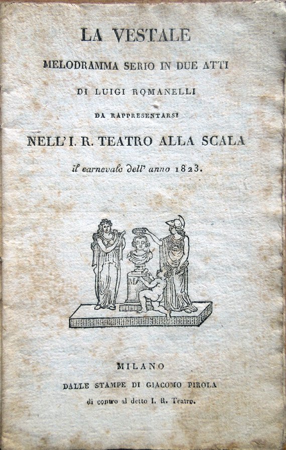 In-16° (16,3 x 10,3 cm), pp. 41, (1), copertina muta editoriale. Qualche normale segno d'uso e del tempo alla copertina. Alla copertina anteriore, firma d'appartenenza, titolo e data scritti da mano coeva; vignetta al frontespizio. Qualche segno d'umido alle pagine, per il resto ben conservato. Musica del M° Giovanni Pacini. Scenografia di Alessandro Sanquirico. Con tutta probabilità si tratta del libretto relativo alla prima rappresentazione del melodramma, andata in scena il 6 febbraio 1823: conferma a questa ipotesi sembra venire dalla "Nota delle feste da ballo che si daranno nell'I. R. Teatro alla Scala nel corrente carnevale 1823", ospitata nell'ultima pagina dell'opuscolo, in cui sono indicati come giorni in cui si sarebbero tenute le feste quelli immediatamente seguenti il 6 febbraio, vale a dire venerdì 7, domenica 9, mercoledì 12, venerdì 14 e sabato 15; è ragionevole dunque pensare che, per pubblicizzare adeguatamente i balli, la pubblicazione sia stata impressa e distribuita almeno alcuni giorni prima del primo appuntamento danzante e che quindi si tratti proprio del libretto della première. Personaggi e interpreti: Giulia, vestale, antica e corrisposta amante di Licinio, Teresa Belloc; Licinio, comandante dell'esercito romano, e vincitore de' Galli, che ritorna in trionfo a Roma dopo l'assenza di cinque anni circa, Isabella Fabbrica; Erennio, gran sacerdote di Vesta, sotto il nome di Flaminio, Luigi Lablache; Cinna, capo legionario, intrinseco amico di Licinio, Savino Monelli; Fabio, console, Carlo Poggiali; Emilia, gran vestale, Giuseppa Rovetta; Fulvia, altra delle vestali, confidente di Giulia, Angela Maria Silvestri Bertozzi; Sempronio, capo degli aruspici, Carlo Donà; Cori: Sacerdoti, Popolo, Vergini Vestali; Comparse: Senatori, Sacerdoti, Aruspici, Guerrieri romani, Prigionieri Galli, Littori, Guardie; Divinità: Vesta, Pallade, Venere e Cupido. L'azione si svolge a Roma. Supplimenti alle prime parti cantanti: Giovanni Carlo Beretta, Pietro Vasoli, Adelaide Carpano, Rosa Tosi. Musicisti: Maestro al cembalo: Vincenzo Lavigna; Primo Violino, Capo d'Orchestra: Alessandro Rolla; Altro primo Violino, in sostituzione del sig. Rolla: Giovanni Cavinati; Primo Violino de' Secondi: Pietro Bertuzzi; Primo Violino per i Balli: Ferdinando Pontelibero; Altro primo Violino, in sostituzione del sig. Pontelibero: Francesco De Bayllou; Primo Violoncello al Cembalo: Giuseppe Storioni; Altro Primo Violoncello: Vincenzo Merighi; Primi Clarinetti a perfetta vicenda: Pietro Tassistro - Felice Corradi; Primi Flauti: Giuseppe Raboni - Carlo Alari; Primi Oboe a perfetta vicenda: Carlo Yvon - Giuseppe Becalli; Primo Corno da Caccia: Agostino Belloli; Primo Fagotto: Gaudenzio Lavaria; Primo Contrabbasso: Giuseppe Andreoli; Professore d'Arpa: Giovanni Battista Rossi. Direttore del Coro: Carlo Salvioni; Editore e proprietario della Musica: Giovanni Ricordi; Macchinisti: Francesco e Gervaso, fratelli Pavesi; Capi illuminatori: Tommaso Alba e Antonio Moruzzi; Capi sarti: Antonio Rossetti, Antonio Majoli; Attrezzista: Ermenegildo Bolla; Berrettonaro: Giosuè Parravicino; Parrucchiere: Innocente Bonacina. Ballerini. Inventore e Compositore de' Balli: Gaetano Gioja. Primi Ballerini serj: Teresa Coralli, Carlo Girard, Antonia Pallerini; Altro primo ballerino: Giuseppe Villa; Primi ballerini per le parti serie: Nicola Molinari, Maria Bocci, Giuseppe Bocci, Pietro Trigambi, Filippo Ciotti; Primi ballerini per le parti giocose: Giovanni Francolini, Celeste Viganò; Primi ballerini di mezzo carattere: Pietro Bondoni, Antonio Bedotti, Michele Damore, Giovanni Baranzoni, Fioravanti Borresi, Antonio Milani; Altri ballerini per le parti: Carlo Bianciardi, Girolamo Pallerini, Giacomo Trabattoni, Antonio Silej; Imperiale Regia Accademia di Ballo. Maestri di Perfezionamento: Arnoldo Leon e Virginia Leon; Maestro di Ballo: Carlo Villeneuve; Maestro di Mimica ed aggiunto: Teresa Monticini; Allievi salariati della suddetta Accademia: Teresa Olivieri, Gaetana Quaglia, Ester Ravina, Giovanna Viscardi, Carolina Alisio, Angela Bianchi, Carolina Elli, Adelaide Cesarani, Carolina Casati, Rachele Cesarani, Giuseppa Turpini, Luigia Novellau, Teresa Carboni, Vincenza Migliavacca, Angela Besozzi, Francesca Terzani, Giuditta Bencini, Giulia Portalupi, Caterina Terzani, Pompea Melici, Tommaso Casati, Antonio Appiani, Giovanni Casati; Corpo di ballo: Giuseppe Nelva, Michele Belloni, Giovanni Goldoni, Gaspare Arosio, Carlo Parravicini, Stefano Prestinari, Gaetano Zanoli, Giuseppe Rimoldi, Francesco Citerio, Francesco Tadiglieri, Fermo Conti, Giuseppe Cipriani, Marco Rossetti, Giuseppe Bosio, Giacomo Gavotti, Giovanni Cozzi, Teresa Ravarini, Barbara Albuzio, Francesca Trabattoni, Maddalena Bianciardi, Giuseppa Belloni, Antonia Fusi, Agostina Rossetti, Antonia Barbini Casati, Massimiliana Feltrini, Rosa Bertoglio, Caterina Massini, Eufrosia Costamagna, Teresa Mazza, Teresa Bedotti, Gaetana Pitti, Teresa Morganti. Supplimenti ai primi ballerini per le parti: Filippo Ciotti, Pietro Bondoni, Teresa Olivieri, Gaetana Quaglia. Luigi Romanelli, librettista italiano (Roma 1751 - Milano 1839); insegnante di lettere e declamazione al conservatorio di Milano, fu per alcuni anni librettista del teatro alla Scala. Fornì libretti a Rossini (La pietra del paragone), Pacini (La vestale), Zingarelli, Mayr, e ad altri. Giovanni Pacini, compositore italiano (Catania 1796 - Pescia, Pistoia, 1867). Figlio di un noto tenore, compì studi musicali a Bologna e a Venezia; appena diciassettenne esordì a Milano come autore dell'opera Annetta e Lucindo. Dal 1822 fu attivo a Lucca, come maestro di cappella della corte ducale (1837) e direttore dell'Istituto musicale (1842). Musicista tra i più fecondi del secolo, di vena facile e con un innato senso della vocalità, scrisse circa novanta opere teatrali rappresentate nei maggiori teatri italiani ed europei. Alla sua produzione appartengono inoltre numerose cantate, oratori, messe e altra musica sacra