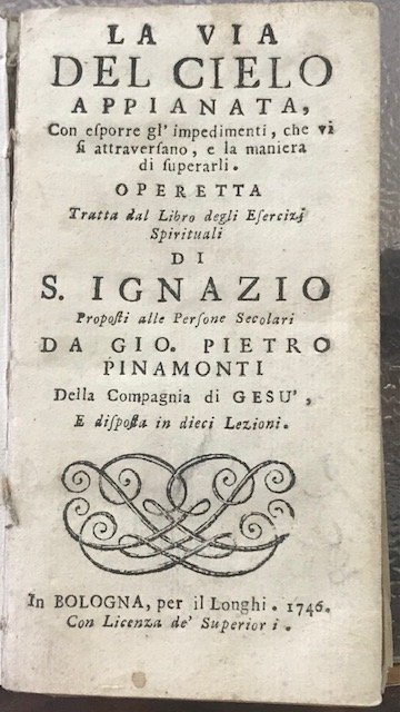 LA VIA DEL CIELO APPIANATA, CON ESPORRE GL'IMPEDIMENTI, CHE VI SI ATTRAVERSANO, E LA MANIERA DI SUPERARLI. OPERETTA TRATTA DAL LIBRO DEGLI ESERCIZI SPIRITUALI DI S. IGNAZIO, PROPOSTI ALLE PERSONE SECOLARI DA GIO. PIETRO PINAMONTI DELLA COMPAGNIA DI GESU' E DISPOSTA IN DIECI LEZIONI.,
