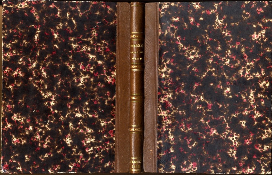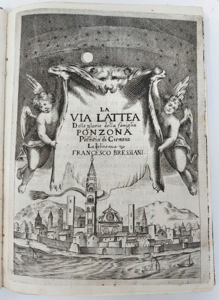 >in-4 antico (cm 19 x 14,5), pp. (20, compreso front. inciso), 127, (1). Legatura ottocentesca in mezza pelle, dorso a nervi con titoli e fregi oro. Bellissimo frontespizio finemente inciso: in alto il cielo stellato, al centro due angeli sorreggono una pelle di leone su cui è scritto il titolo, in basso magnifica veduta di Cremona con il Po in primo piano; grande albero genealogico più volte ripiegato f.t. (montato su finissima tela) ed inciso in rame da Giacinto Ravazola. Nelle pagine preliminari svariati madrigali e sonetti di diversi autori in lode della famiglia Ponzona e dell'opera. Prima edizione (e probabilmente unica) di questo importante studio storico-araldico, rarissimo. «L'opera passa in rassegna fatti e personaggi insigni della famiglia dalle origini al 1646; contiene i privilegi concessi e un indice degli autori che hanno trattato nelle loro opere della famiglia Ponzona» (Cat. Vinciana 743). Il cremonese Fr. Bressiani (morto nel 1700) fu notaio e stimato storiografo. Ottimo esemplare. Manca a STC, XVII sec. Michel-Michel I, 213. Spreti 583. Colaneri 237.