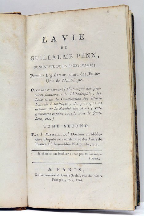 La Vie de Guillaume Penn, fondateur de la Pennsylvanie; Premier Législateur connu des Etats-Unis de l'Amérique. Ouvrage contenant les fondemens de Philadelphie, des Loix et de la Constitution des Etats-Unis de l'Amérique, des principes et actions de la Société des Amis (vulgairement connus sous le nom de Quakers).