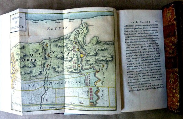 Ensemble de deux volumes de format in 8° de; pour le t. I: 1 f. (faux titre); frontipice (portrait); 1f. (titre); 1 f. (dédicace); 494 pp.; deux planches dépliantes gravées sur cuivre et finement aquarellées représentant l'une "Le Blocus de Dunkerque" et l'autre "L'Affaire de Quiberon" et pour le t. II: 1 f; (faux-titre); 1f. (titre); 2 pp. (préface); 490 pp. Il manque la planche du "Théâtre de La Guerre sur Le Rhin". Reliure de l'époque en pleine basane blonde , marbrée; dos lisse décor Premier Empire. Cachet de Bibliothèque Populaire sur chaque 1ère garde. Quelques rousseurs sur certains cahiers. Coiffes et coins légèrement frottés. Nombreuses erreurs de pagination mais le texte est bien complet. Voir les photos. Peu fréquent.