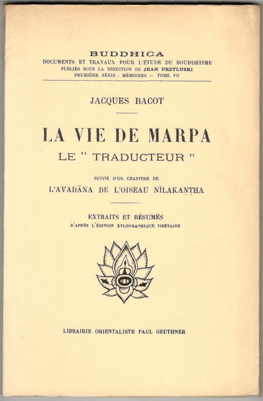 La vie de Marpa le 'traducteur'. Suivie d'un chapitre de l'Avadana de l'oiseau Nilakantha. Extraits et résumés d'après l'édition xylographique tibétaine.