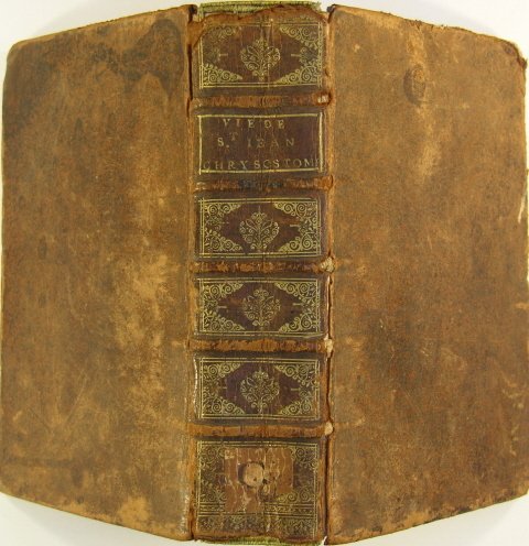 A Paris, chez Charles Savreux, 1665. 2 tomes en un fort volume in/8 reliure plein veau, dos à nerfs à caissons doré et pièce de titre, vignette en page de titre, bandeaux et culs de lampes, 8 f., 1059 pages. Reliure postérieure avec quelques défaut : coiffes manquantes, mors partiellement ouverts, usures marquées sur les coins supérieurs et bordure ; petite tache décroissante en bordure supérieure de certains feuillets du volume 1. Jean Chrysostome (Antioche entre 344 et 349, mort en 407 près de Comana) a été archevêque de Constantinople et l'un des pères de l'Église grecque. Son éloquence est à l'origine de son surnom de Chrysostome. Cependant, sa rigueur et son zèle réformateur l'ont conduit à l'exil et à la mort. C'est un saint de l'Église catholique, de l'Église orthodoxe et de l'Église copte, fêté le 13 septembre en Occident et le 30 janvier en Orient.2 volumes in one fat 8vo in full contemporary calf, ribbed spine with gilt panels and label, engraved vignette in title page, head & tail-pieces, [8], 1059 p. Few flaws : tips lacking, joints partially cracked, rubbing on borders & joints, small & decreasing spot on upper border of some sheets.