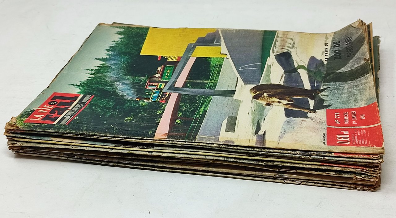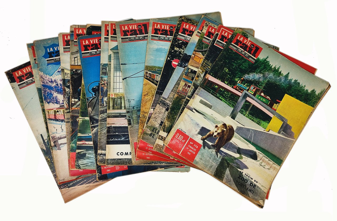 Lotto di 17 numeri (non consecutivi) del 1961, della rivista illustrata settimanale, francese, dedicata ai treni e al mondo ferrovoiario, 'LA VIE DU RAIL / notre metiere'. Numeri presenti in questo lotto:; - N° 778 (1 janvier 1961); - N° 809 (13 aout 1961); - dal numero 812 (del 17 septembre 1961) al numero 820 (del 12 novembre 1961); - dal numero 822 (del 26 novembre 1961) al numero 827 (del 31 décembre 1961). Ogni numero si compone di una ventina di pagine pagine numerate (ad eccezione di qualche numero più consistente).; Ogni numero è ricchissimo di immagini per lo più in bianco e nero nel testo.; Copertine illustrate a colori.; Dimensioni di ciascuna rivista: 24,5 x 31 cm circa.; Stato di conservazione: Il lotto si presenta, complessivamente, in buone condizioni nonostante la presenza di qualche piccolo segno del tempo e dell'utilizzo. In particolare, si segnala, che le copertine (presenti ed integre), in genere, si presentano staccate dalle due graffette metalliche che servivano come rilegatura (e, quindi, staccate dal corpo della rivista), una leggera piega trasversale sul corpo di diversi numeri (probabilmente perchè la rivista veniva spedita), qualche piccolo taglietto sulla linea di rilegatura tra la copetina anteriore e quella posteriore di qualche numero, minuscoli taglietti sui bordi di qualche pagina, la copertina del numero 778 è stata riparata in maniera artigianale con del nastro adesivo e della striscie di carta; pieghe e stropicciature (di natura editoriale) sul margine superiore delle agine centrali del numero 820. Nessuna scritta o segno nel testo. Numerosi e interessanti gli articoli presenti in questo lotto.; Qualche esempio:; - Le train du zoo de Portland; - Un nouveau wagon porteur d'automobiles; - Wagon-Tombereau à toit ouvrant 'C.I.M.T. Forest'; - Entrée de la locomotive 'Caerphilly-Castle' au Science Museum de Londres; - Mise en servuce du train 'TALGO' sur les lignes Madrid-Barcelone et Madrid-Seville; - Les nouvelles rames automotrices diesel-électriques des C.F. néerlandais; - La nouvelle locomotive AE 4/6 III des chemins de fer fédéraux; - Tramways de Marseille; - Développement du 'PIGGY-BACK' au Canadian Pacific RailWay; - Europabus; - La Ssmyfi 439; - Le nouveau ferry-boat 'KNUDSHOEVED'; - Les tramways électriques Valence - St-Péray; - Modernisation des garages de Paris-Ourcq; - Le rail francais a Moscou; - Centenaire de la gare de Nevers (1861 - 1961); - La 63 machine record du train de Palavas; Inauguration du monument a la locomotive a vapeur sur l'initiative des modélistes ferroviaires de Brescia; - Le chemin de fer de Bordeaux - La Teste; - Evolution du décor des voitures-buffet; - Les ateliers de SAINTES; - Le Perou et ses transports; - Le trains de luxe de TROUVILLE - DEAUVILLE; - .