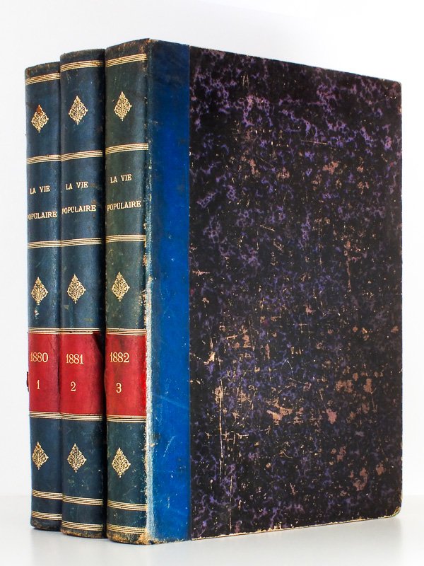 3 vol. in-4 rel. demis-basane bleue avec pièces rouges sur dos, numéroration continue des volumes (du n° 1 au 3), texte sur trois colonnes, ill. noir et blanc, La Vie Populaire, Librairie du Petit Parisien - Rue d'Enghien, Paris, 1880 à 1883. Les volumes correspondent chacun à une année. Env. 420 pp. par semestre, soit env. 2.400 pp. au total. Etat satisfaisant (couv. lég. frottées, rouss. d'usage parfois assez fortes, qques petits accrocs, état très satisfaisant par ailleurs). Le Magazine La vie Populaire était un magazine lancé en 1880 par la société d'édition du grand quotidien de l'époque Le Petit Parisien. Hebdomadaire à l'origine, il devint bi-hebdomadaire à partir de 1884. Ce magazine, qui contenait des romans et nouvelles, ainsi que des contributions historiques, récits de voyages, etc., connut un grand succès, dû en particulier à la collaboration d'écrivains tels qu'Emile Zola, Alphonse Daudet, Guy de Maupassant, Paul Bourget, les Goncourt ou Catulle Mendès. A la fin de chaque tome semestriel, une table des matières. Le présent ensemble contient les tous premiers numéros de cette revue, avec par exemple, les livraisons complètes de "Boule de Suif" de Maupassant, "Un coeur simple" de Flaubert, "Pot-Bouille" de Zola, "Numa Roumestan" de Daudet. Prix en l'état, pour l'ensemble. Poids de 6,7 Kg.