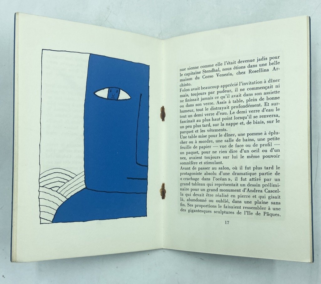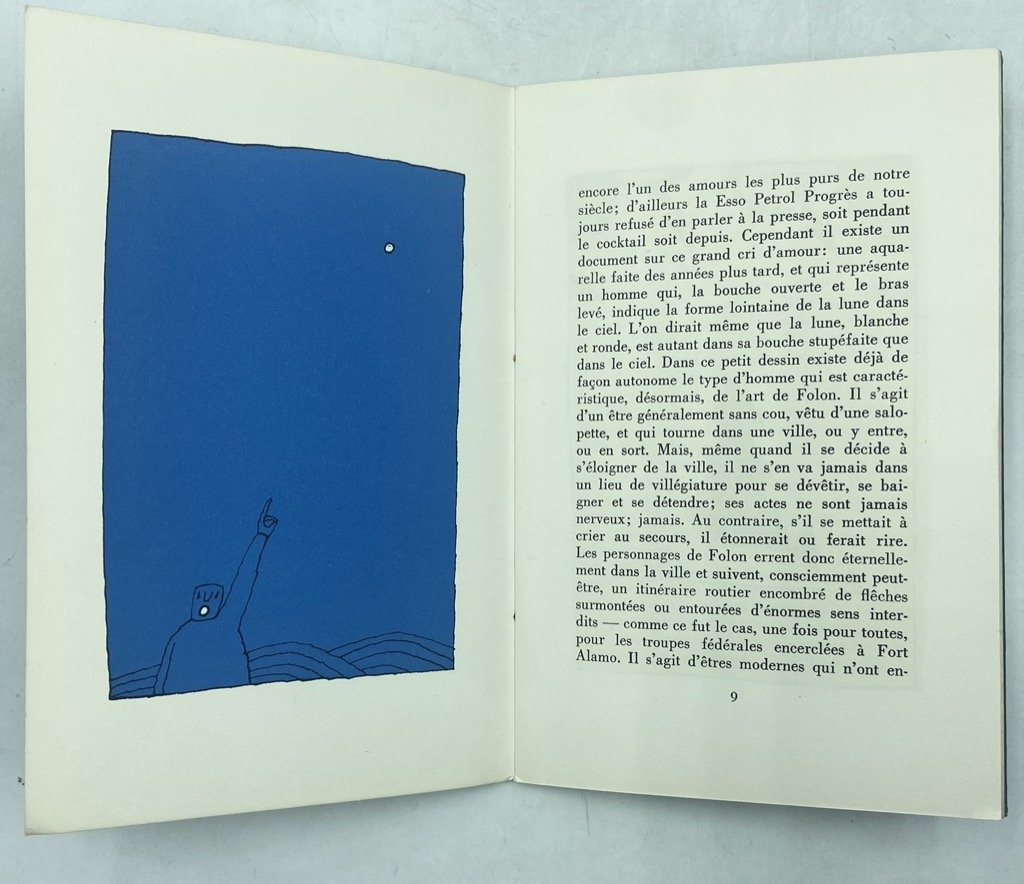 Brossura editoriale illustrata, spillato, cm 18.5 x 12.5, pp 27 (5) con 10 illustrazioni in nero e blu di Folon. Dedica a penna di privato dono sulla prima bianca; buono stato, ossidazione della cucitura metallica. Giorgio Soavi, collaboratore di Adriano Olivetti dapprima in Comunità poi per le iniziative editoriali ed artistiche dell'azienda eporediese, fu fautore della prolifica collaborazione con Jean-Michel Folon (Uccle 1934 - Monaco 2005), che illustrò diverse strenne, pubblicazioni e manifesti. Uno dei primi e più fortunati esempi di questa collaborazione fu l'Agenda Olivetti 1969, le cui tavole conobbero una tiratura a parte pubblicata, in cofanetto progettato da Enzo Mari, con l'accompagnamento del saggio di Soavi «La vita, anche sentimentale, di Folon». Il testo è riproposto, in versione francese, in questo libretto in sedicesimo pubblicato in 1000 esemplari da Milano Libri, per il quale Folon realizzò dieci disegni inediti, che riprendono e variano i temi della serie per l'Agenda declinandoli in una suggestiva campitura blu.