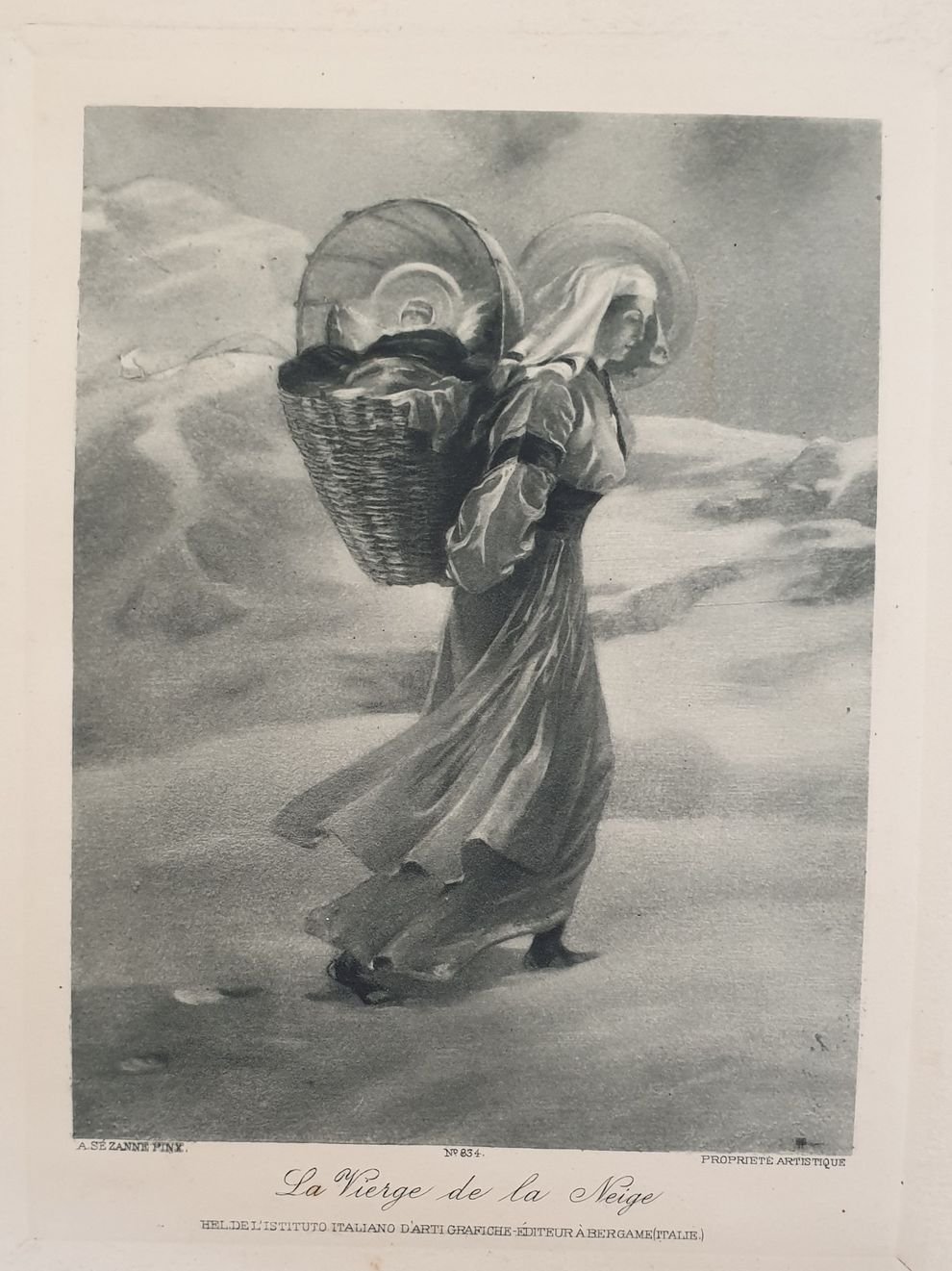 Incisione calcografica di inziio novecento che mostra la Vergine della neve Autore: da un disegno di A. Sezanne Data: inizio novecento Dimensioni foglio: mm 245x170. Dimensione incisione al margine: mm 150x110. In buone condizioni.Calcographic engraving of early 20th century featuring Virgin of the snow Author: after A. Sezanne Date: early 20th century Size of the page: mm 245x170. Size in the print: mm 150x110. In good conditions.