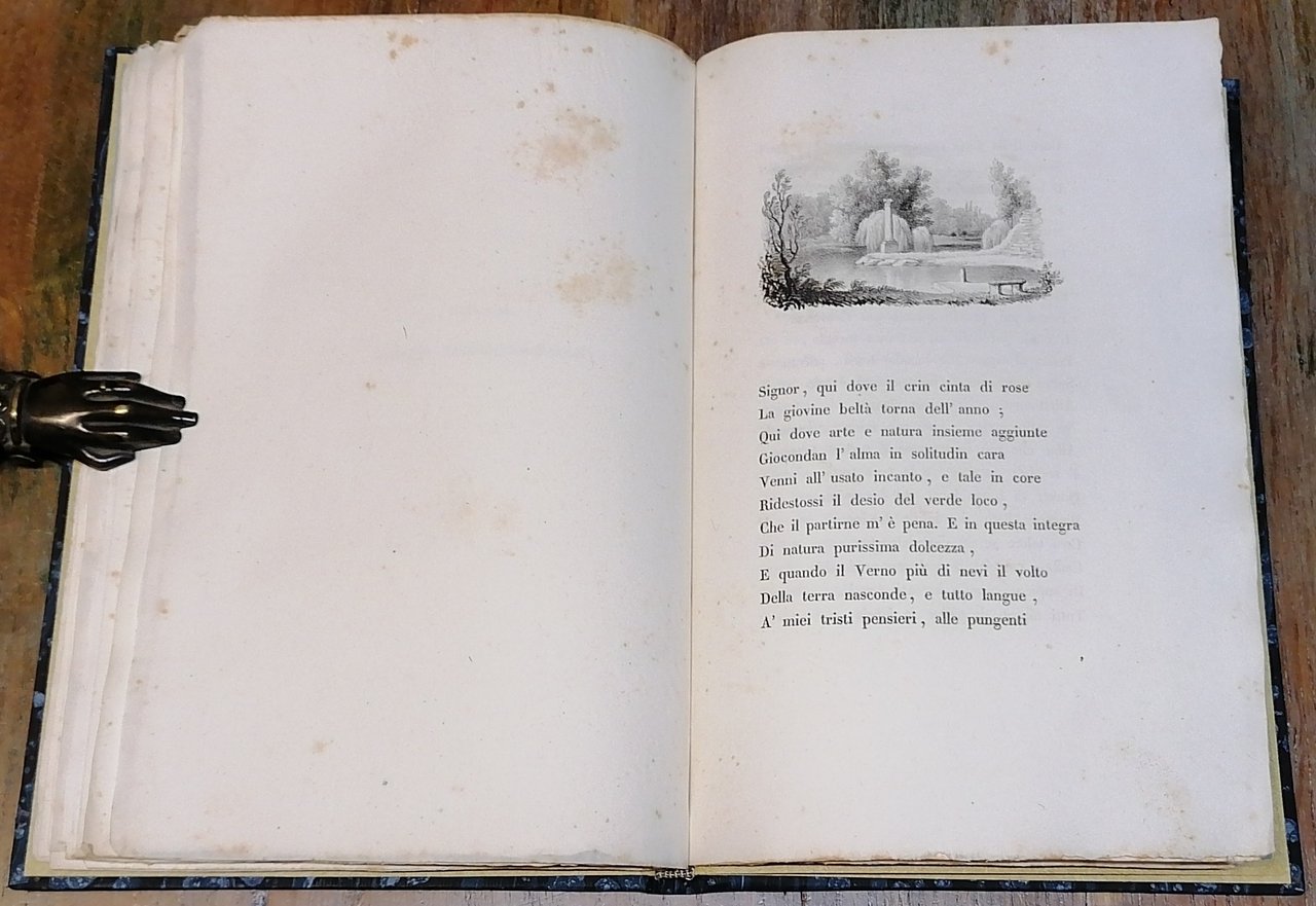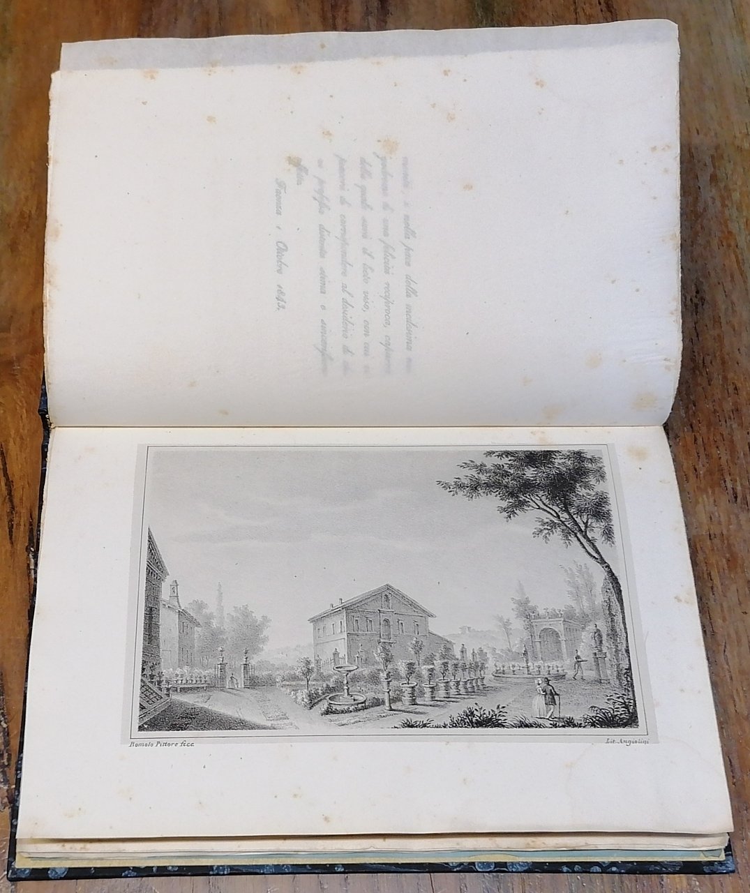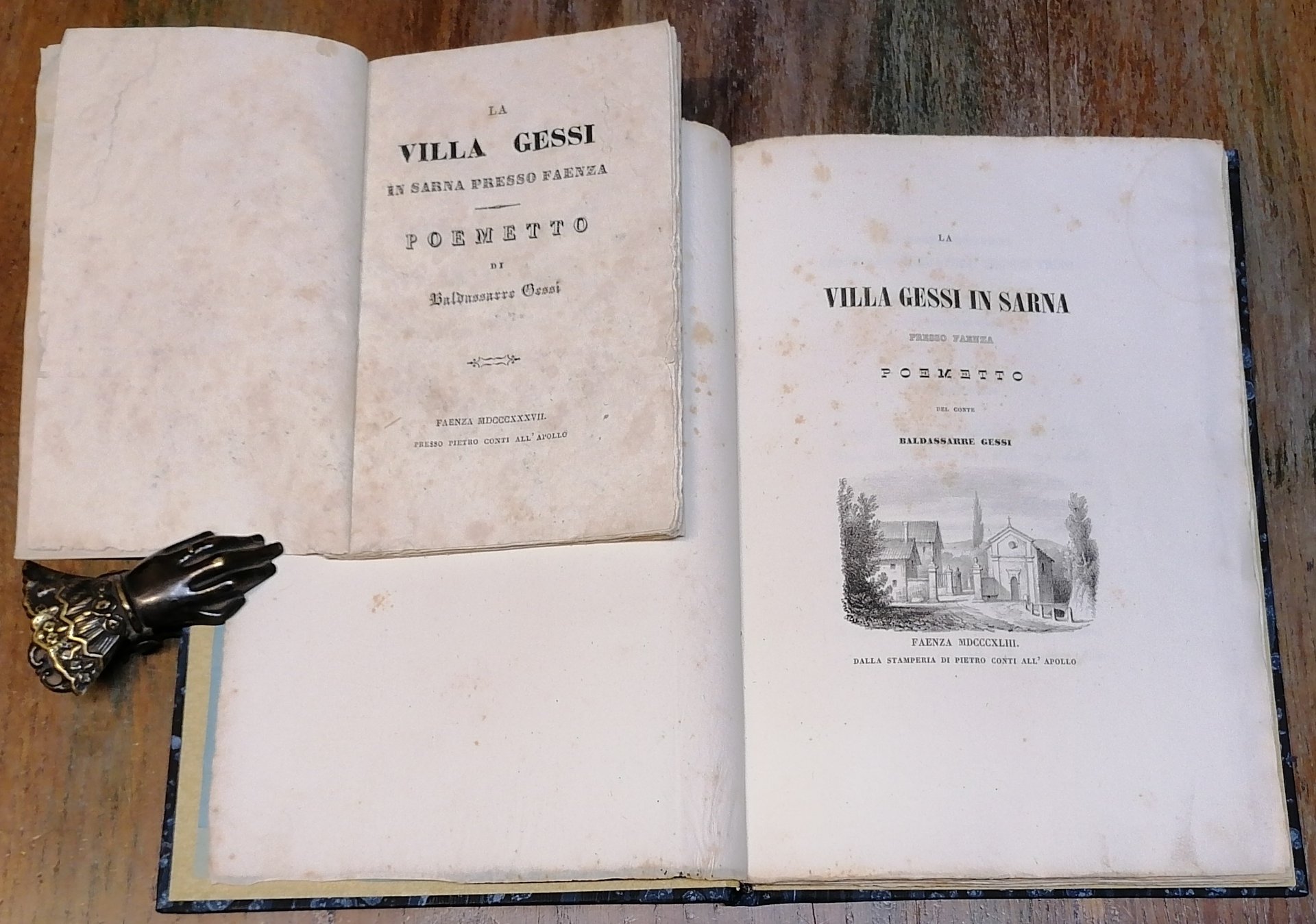 (Romagna; Faenza; Ville storiche; Villa Gessi detta "dei Canalacci" in Sarna) "La Villa Gessi in Sarna presso Faenza. Poemetto di Baldassare Gessi" : Faenza, presso Pietro Conti all' Apollo, 1837, cm 18,5 x 12, brossura originale, pp. 39,(3), prima edizione. "La Villa Gessi in Sarna. Poemetto del conte Baldassarre Gessi" : Faenza, dalla Stamperia di Pietro Conti all' Apollo, 1843, cm 26,5 x 18, legatura moderna in cartone rigido rivestito di carta decorata, conservate le copertine della brossura originale, pp. 71,(5), con frontespizio, 4 testate , 4 tavole fuori testo, il tutto in litografia e con veline di protezione, opera del pittore faentino Romolo Liverani, seconda edizione a cura di Antonio Gessi, nipote dell'autore, con l'aggiunta dell'apparato iconografico e del poemetto in versi sciolti "Epistola di Antonio Gessi sopra alcuni cambiamenti fatti al Lago di Sarna". Prima edizione 1837 : mende restaurate alla brossura, peraltro esemplare ben conservato. Seconda edizione 1843 : lievi e trascurabili tracce di ossidazione, peraltro ottimo stato di conservazione.