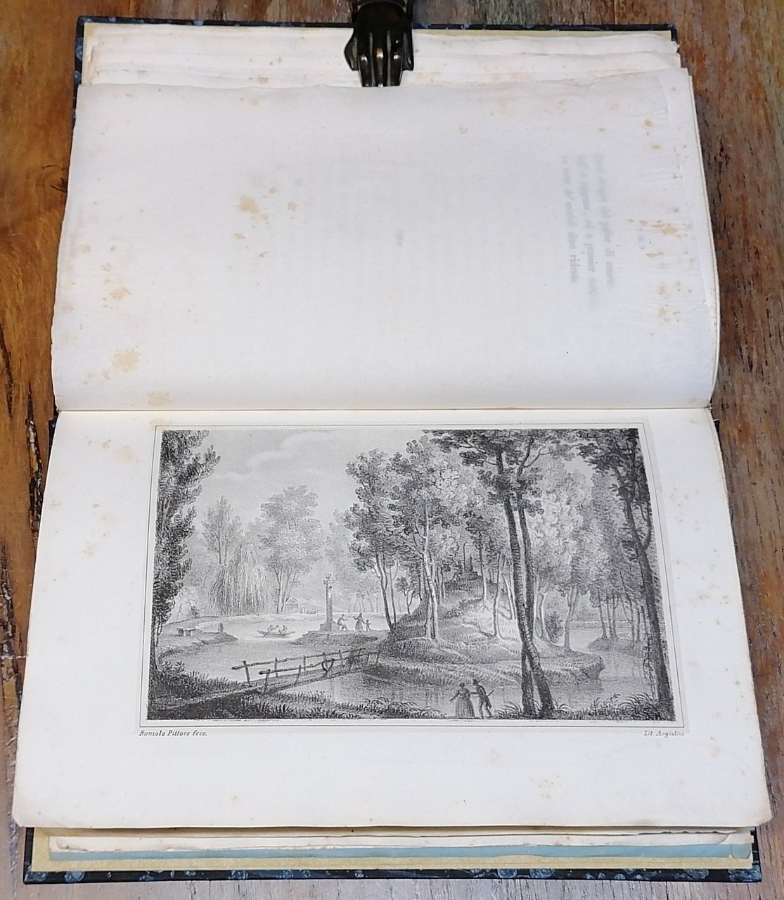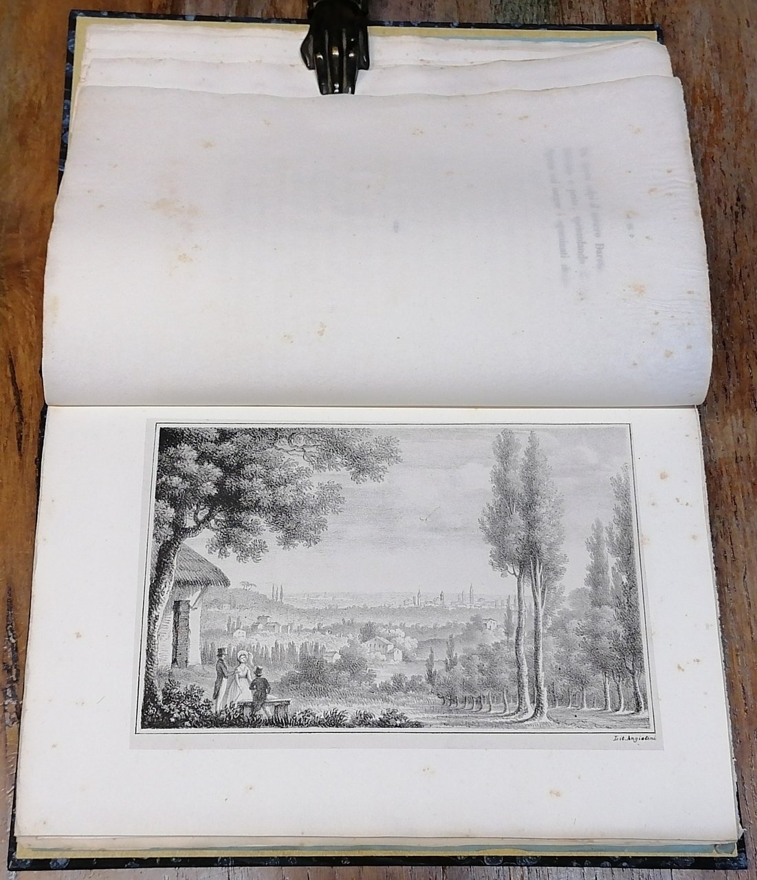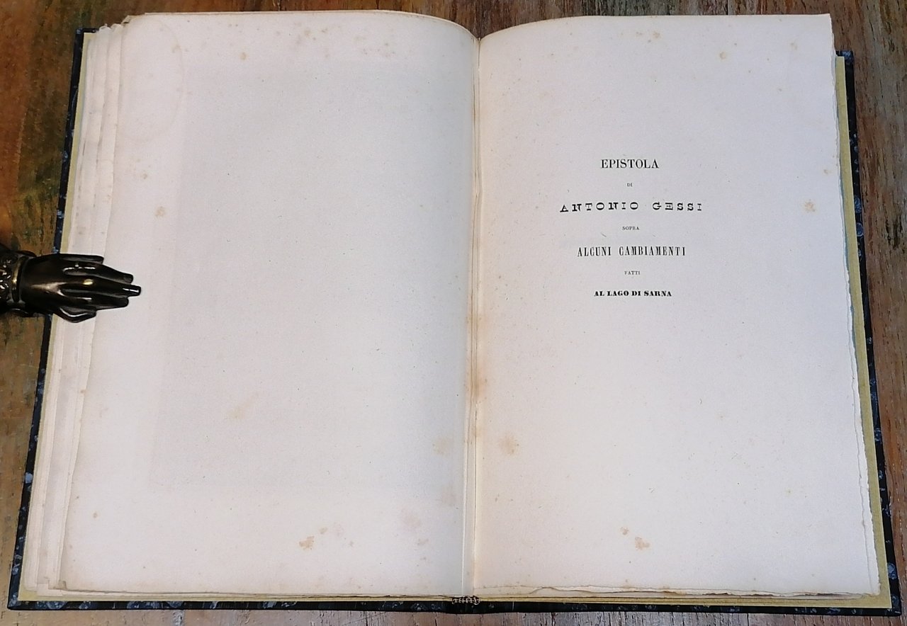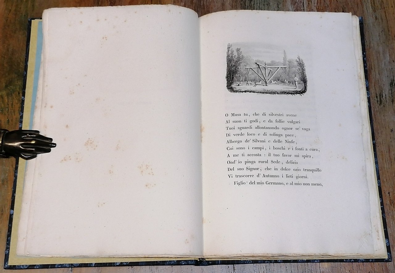 (Romagna; Faenza; Ville storiche; Villa Gessi detta "dei Canalacci" in Sarna) "La Villa Gessi in Sarna presso Faenza. Poemetto di Baldassare Gessi" : Faenza, presso Pietro Conti all' Apollo, 1837, cm 18,5 x 12, brossura originale, pp. 39,(3), prima edizione. "La Villa Gessi in Sarna. Poemetto del conte Baldassarre Gessi" : Faenza, dalla Stamperia di Pietro Conti all' Apollo, 1843, cm 26,5 x 18, legatura moderna in cartone rigido rivestito di carta decorata, conservate le copertine della brossura originale, pp. 71,(5), con frontespizio, 4 testate , 4 tavole fuori testo, il tutto in litografia e con veline di protezione, opera del pittore faentino Romolo Liverani, seconda edizione a cura di Antonio Gessi, nipote dell'autore, con l'aggiunta dell'apparato iconografico e del poemetto in versi sciolti "Epistola di Antonio Gessi sopra alcuni cambiamenti fatti al Lago di Sarna". Prima edizione 1837 : mende restaurate alla brossura, peraltro esemplare ben conservato. Seconda edizione 1843 : lievi e trascurabili tracce di ossidazione, peraltro ottimo stato di conservazione.
